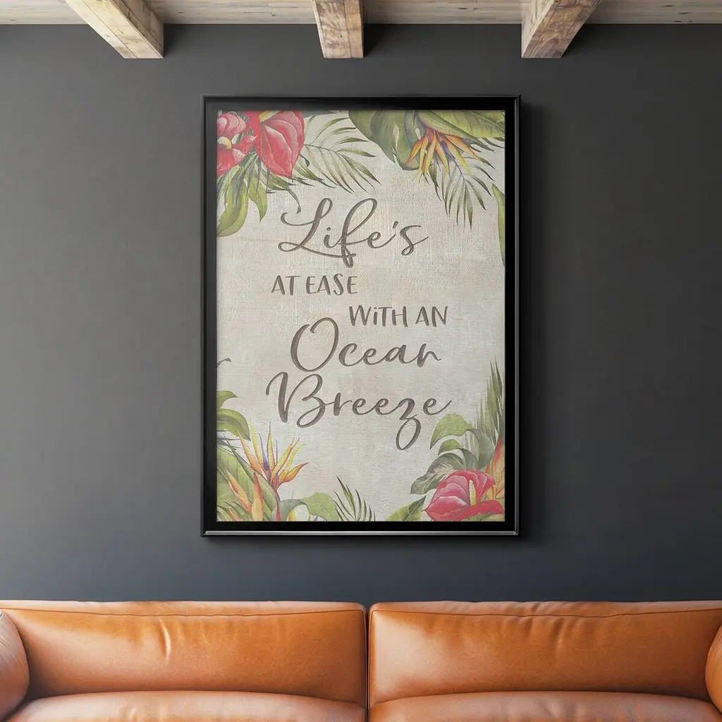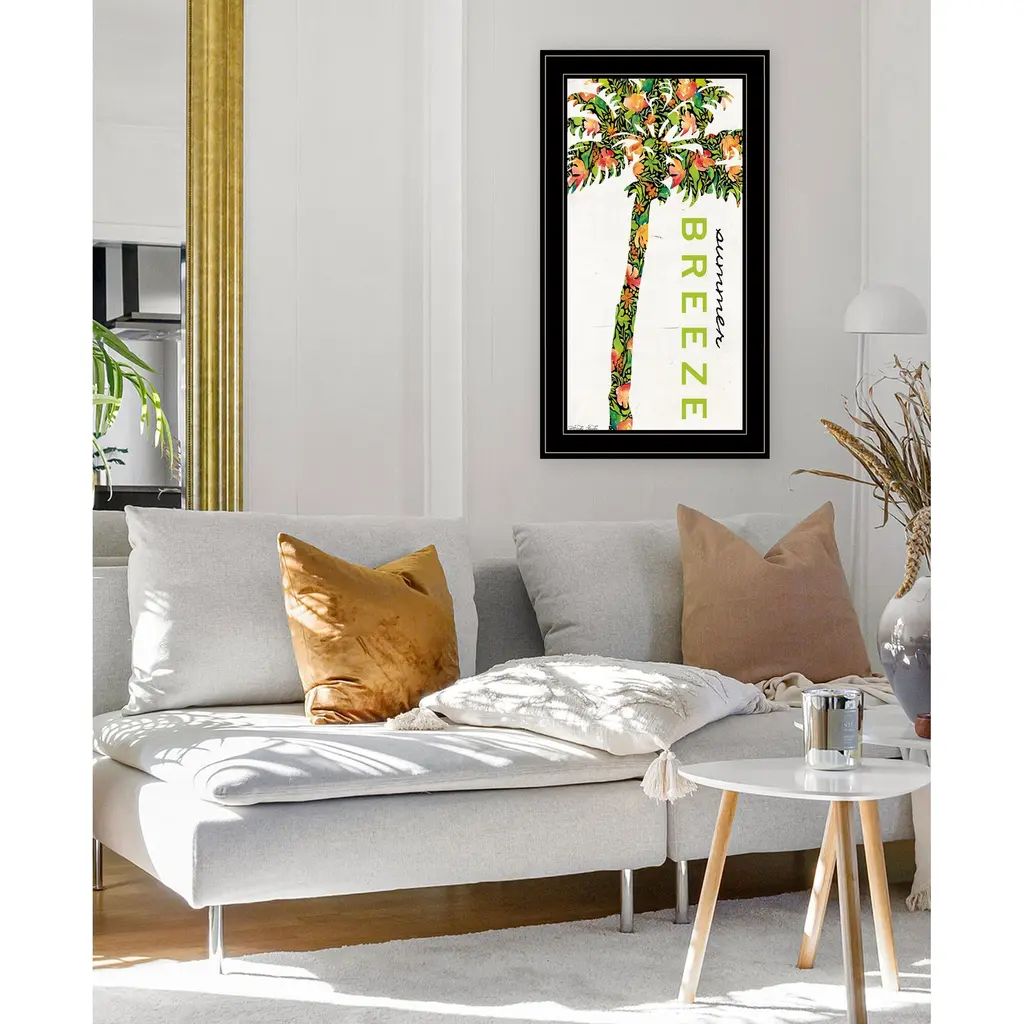 "Summer Breeze - Palm Tree" is by Artisan Cindy Jacobs. A framed art piece of a Palm tree having a matrix of colors: yellow, oranges, greens and script saying: Summer Breeze! What a cheery mix of color for any room in your beach home. Our products are proudly made by skilled American workers. The surface of our framed art is textured with a fade resistant coating, so no glass is necessary. A vegetable-based glue is used in the production of our products, and our frames are crafted from 100% recycled material, in keeping with our environmentally friendly approach toward manufacturing. Arrives ready to hang. Crafted with utmost care and precision by skilled American crafters, this artwork is a testament to their unwavering commitment to quality. Each brushstroke exudes passion and dedication, bringing the scene to life in vivid detail. The fade-resistant texture coating ensures that the vibrant colors will remain intact, preserving the canvas-like appearance for years to come. Investing in a piece that is truly one-of-a-kind. No other artwork can capture the same blend of tranquility, elegance, and wanderlust. It is a testament to your discerning taste and appreciation for the beauty that nature and art can conjure together. Brought to you by Continents Apart.