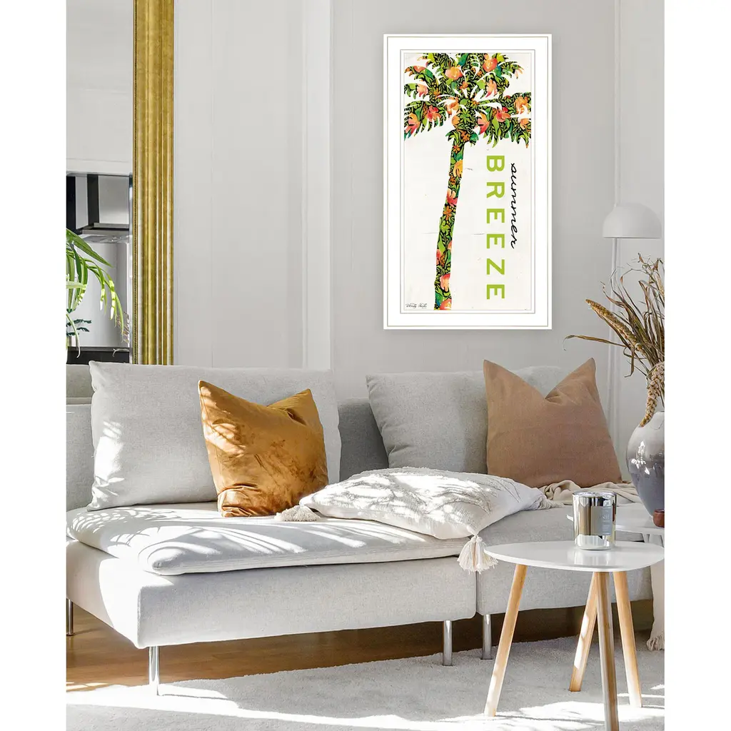 "Summer Breeze - Palm Tree" is by Artisan Cindy Jacobs. A framed art piece of a Palm tree having a matrix of colors: yellow, oranges, greens and script saying: Summer Breeze! What a cheery mix of color for any room in your beach home. Our products are proudly made by skilled American workers. The surface of our framed art is textured with a fade resistant coating, so no glass is necessary. A vegetable-based glue is used in the production of our products, and our frames are crafted from 100% recycled material, in keeping with our environmentally friendly approach toward manufacturing. Arrives ready to hang. Crafted with utmost care and precision by skilled American crafters, this artwork is a testament to their unwavering commitment to quality. Each brushstroke exudes passion and dedication, bringing the scene to life in vivid detail. The fade-resistant texture coating ensures that the vibrant colors will remain intact, preserving the canvas-like appearance for years to come. Investing in a piece that is truly one-of-a-kind. No other artwork can capture the same blend of tranquility, elegance, and wanderlust. It is a testament to your discerning taste and appreciation for the beauty that nature and art can conjure together. Brought to you by Continents Apart.