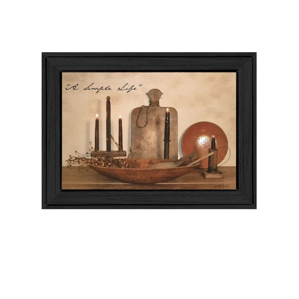 "A Simple Life" is by Artist Billy Jacobs this decorative framed wall art features a rustic wood countertop complete with a wooden bowl and a variety of wooden spoons. Behind the bowl you can see a handful of lit candles and a cutting board. This beautiful still life image is a more primitive style but would add a dash of rustic charm to any location it is hung. Our products are proudly made by skilled American workers. The surface of our framed art is textured with a fade resistant coating, so no glass is necessary. A vegetable-based glue is used in the production of our products, and our frames are crafted from 100% recycled material. In keeping with our environmentally friendly approach towards manufacturing. Arrives ready to hang