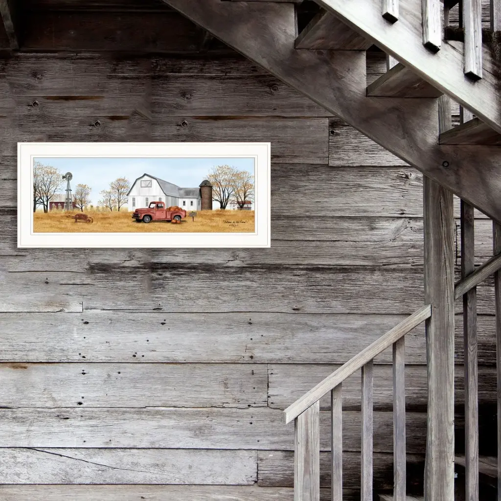 BJ1191-226G "Autumn on Farm" by artisan Billy Jacobs. This decorative white framed print (27x11) of Autumn leaves, pumpkins piled in a vintage red pickup truck for sale; homestead, windmill and corn stalks in the distance . This framed art is totally American made. The surface of the art is coated with a fade resistant texture which gives it a canvas-like appearance. No glass is necessary. Arrives ready to hang.