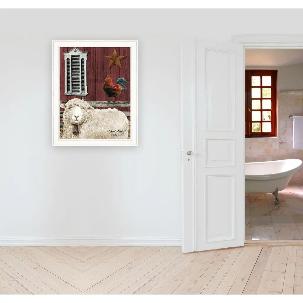BJ1055XGP-226G "Good Morning" a framed Giclee print by artist Billy Jacobs, in a stylish 21" x 27" white frame. This art features a large fluffy sheep looking right at you in the foreground. Behind the sheep is a wooden fence with a red rooster perched atop. The background is the side of a red barn complete with a rustic metal star and vintage louvered barn vent. This framed art is totally American made. The surface of the art is coated with a fade resistant texture which gives it a canvas-like appearance. No glass is necessary. Arrives ready to hang. About "Giclee prints": With giclee's the inks are actually sprayed into place similar to an ink jet printer. Even under a magnifier there seems to be no dots! Giclee's also use specially made inks with true light fast pigments. This ensures that the artwork you purchase will retain its color. Independent laboratories have rated the inks to be fade resistant to 115 years. The giclee is basically the best available.