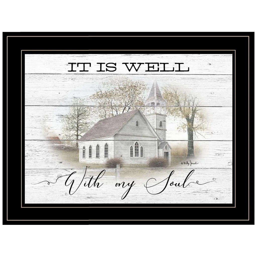 BJ1222-704G "It Is Well" by artisan Billy Jacobs, in a decorative grooved black (19x15) frame. This art features a small country church with a barn in the background and the print placed on a shiplap background. Script says: "It is Well with my Soul." This artwork is drawn by the famous Ohio artisan Billy Jacobs. The surface of the print is textured with a fade resistant coating so no glass is necessary. Arrives ready to hang. Made in the USA by skilled American workers.