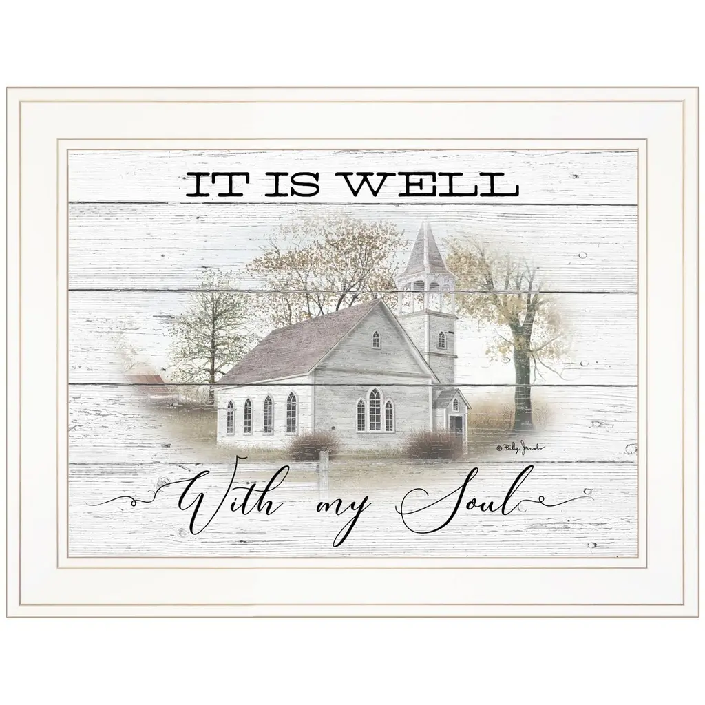 BJ1222-226G "It Is Well" by artisan Billy Jacobs, in a decorative grooved (19x15) white frame. This art features a small country church with a barn in the background and a shiplap background. Script says: "It is Well with my Soul." This artwork was created by the famous Ohio artisan Billy Jacobs. The surface of the print is textured with a fade resistant coating so no glass is necessary. Arrives ready to hang. Made in the USA by skilled American workers.