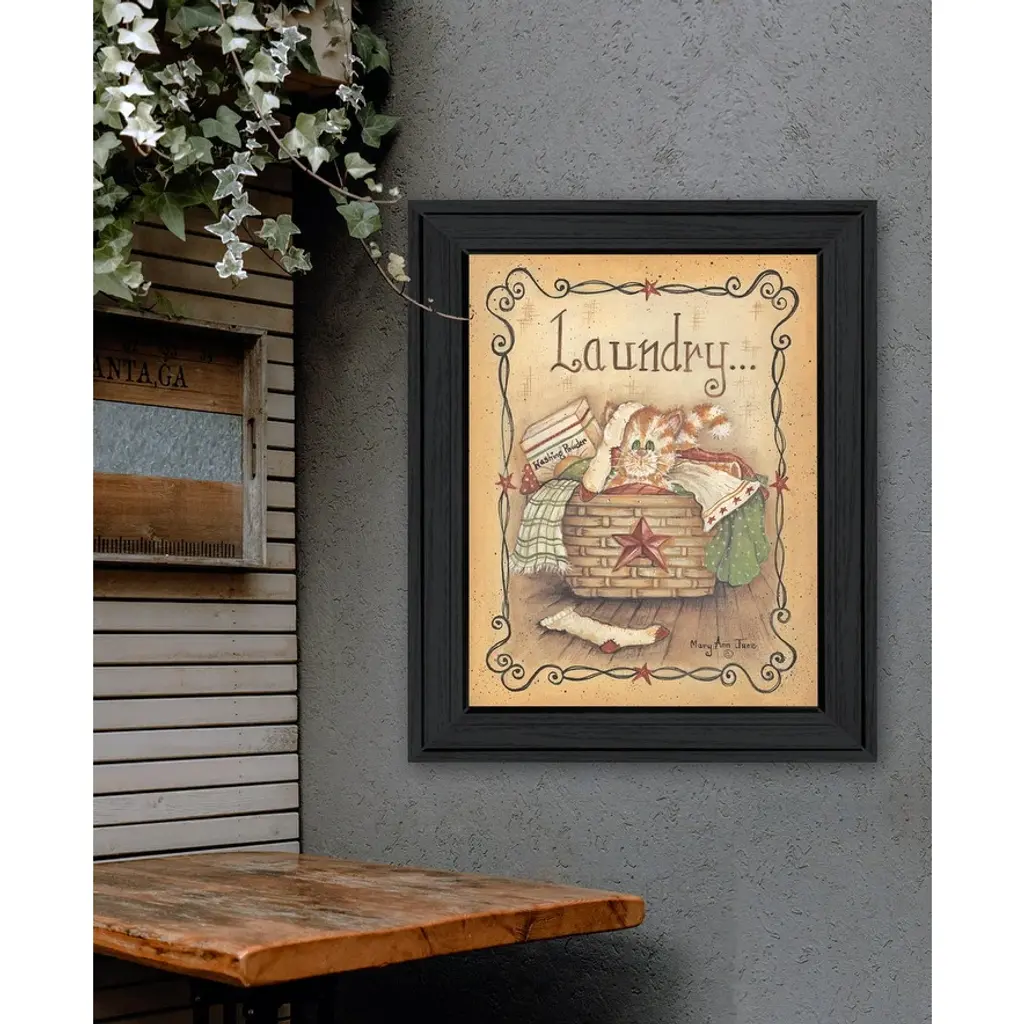 "Laundry" is by Artisan Mary Ann June. This laundry artwork is so cute with a kitten peaking out of the clothes basket among the dirty clothes. Our products are proudly made by skilled American workers. The surface of our framed art is textured with a fade resistant coating, so no glass is necessary. A vegetable-based glue is used in the production of our products, and our frames are crafted from 100% recycled material. In keeping with our environmentally friendly approach towards manufacturing. Arrives ready to hang.