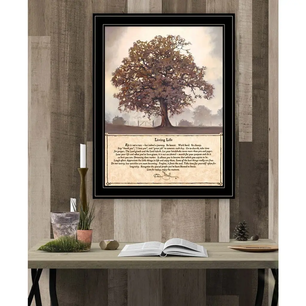 "Living Life" by artisan Bonnie Mohr. This 15x11 Black framed print of tree has a reminder from the artist written below it that "Life is not a race - but indeed a journey". This muted color print of a tree in the country with inspiring quote adds a thoughtful touch to any room. Crafted by skilled American crafters and coated with a fade-resistant texture, this piece has a canvas-like appearance that will last for years to come. Invest in a piece that is truly one-of-a-kind.
