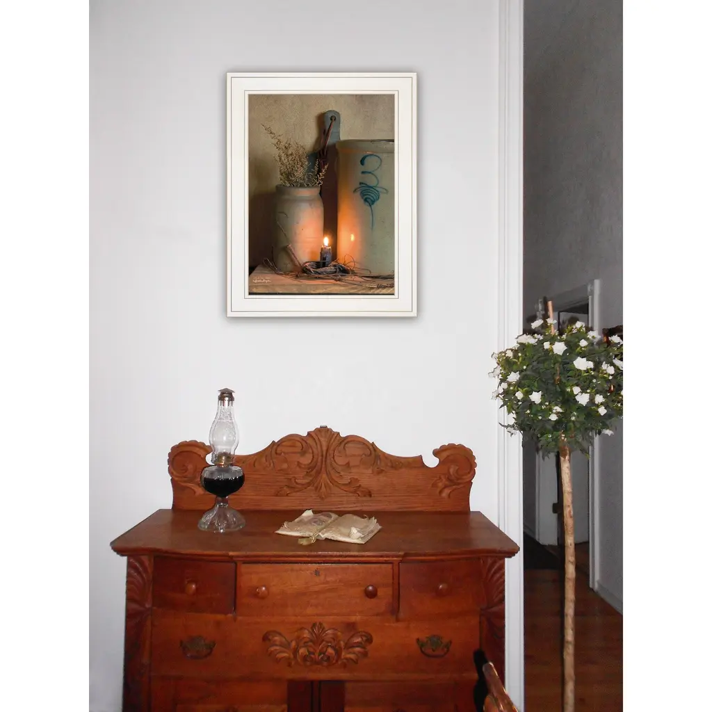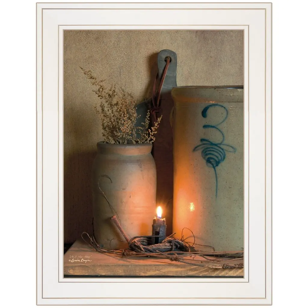BOY374-226G "No. 3 Bee Sting" on a crock by artisan Susan Boyer. This decorative white framed print (15x19) of a beautiful large crock with the Bee Sting insignia imprinted on each crock. Primitive items: smaller crock, wooden cutting board, primitive candle lite. This framed art is totally American made. The surface of the art is coated with a fade resistant texture which gives it a canvas-like appearance. No glass is necessary. Arrives ready to hang. To view a 2-piece vignette, including this print, please search: V451-226G