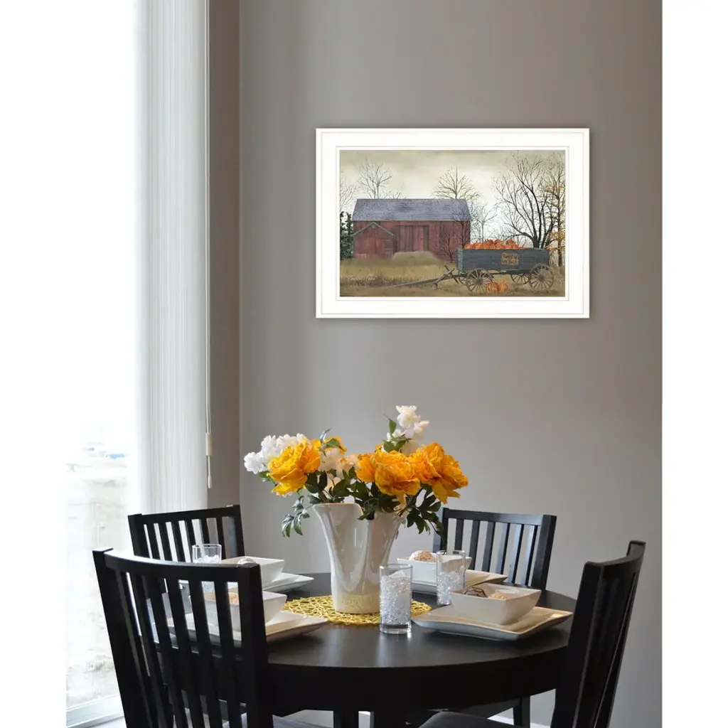 "Pumpkin Wagon" is by Artisan Billy Jacobs. This decorative framed wall art features an old wooden hay wagon full of pumpkins for sale for the Halloween season. The wagon sits in front of a red barn framed by bare trees that have shed their leaves for the season. This perfect autumn print is one to add to any fall collection. Our products are proudly made by skilled American workers. The surface of our framed art is textured with a fade resistant coating, so no glass is necessary. A vegetable-based glue is used in the production of our products, and our frames are crafted from 100% recycled material. In keeping with our environmentally friendly approach towards manufacturing. Arrives ready to hang