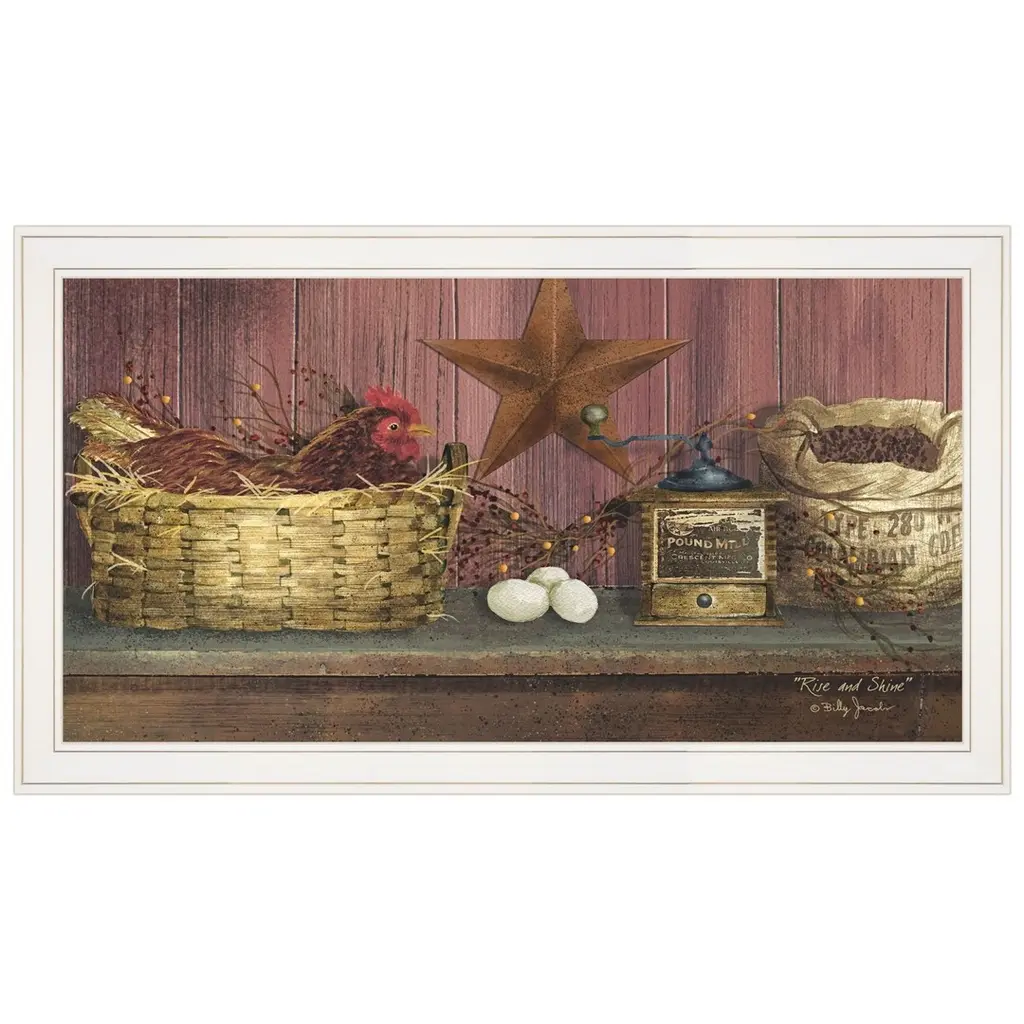 BJ1053AGP-226G Rise & Shine by Billy Jacobs. This decorative framed print(33x19) of a primitive setting of chicken in a basket, eggs, feed sack, grinder. Print is textured no need for glass, and arrives ready to hang.