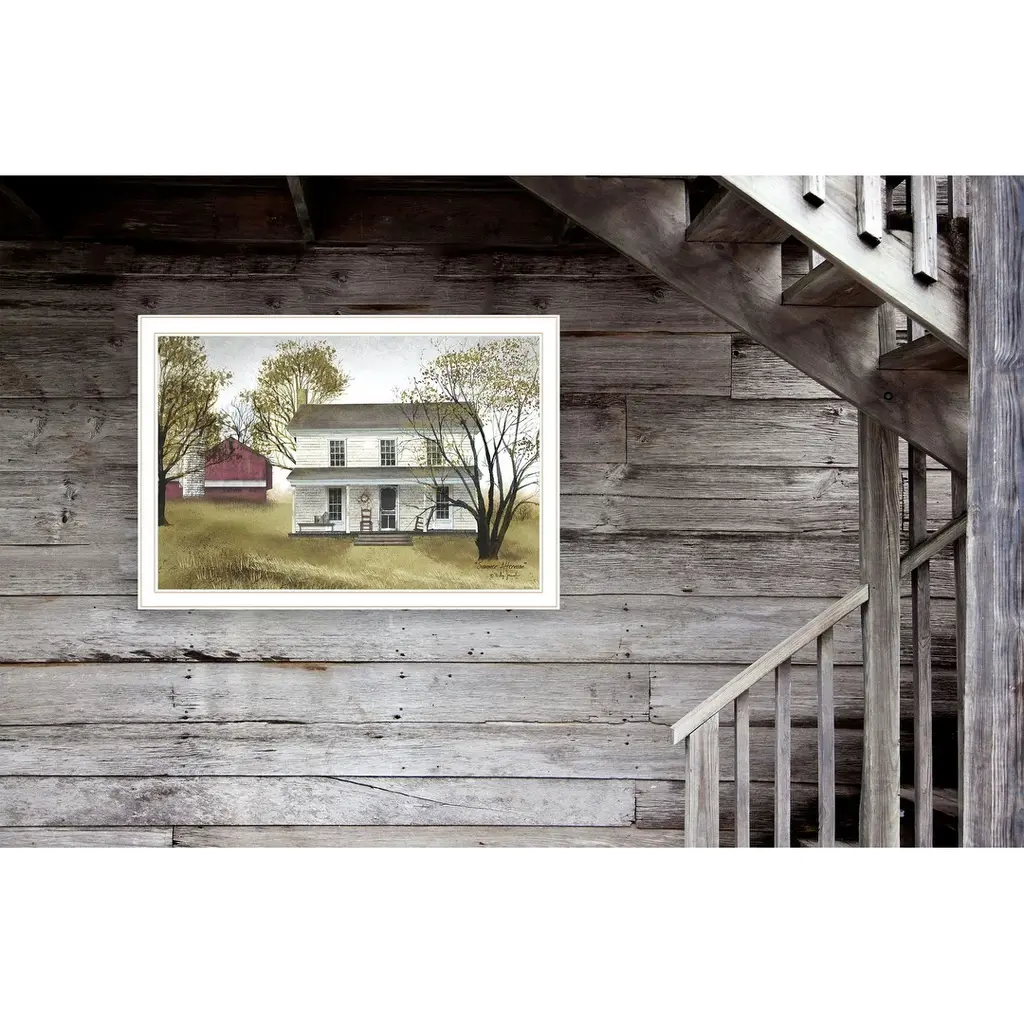 BJ105YYGP-704G "Summer Afternoon" a framed Giclee print by artist Billy Jacobs, in a stylish frame. This art features a vintage 2 story white clapboard house, with a couple wooden chairs on the front porch. A red barn and silo sit back to the left, behind a couple shade trees. This framed art is totally American made. The surface of the art is coated with a fade resistant texture which gives it a canvas-like appearance. No glass is necessary. Arrives ready to hang. About "Giclee prints": With giclee's the inks are actually sprayed into place similar to an ink jet printer. Even under a magnifier there seems to be no dots! Giclee's also use specially made inks with true light fast pigments. This ensures that the artwork you purchase will retain its color. Independent laboratories have rated the inks to be fade resistant to 115 years. The giclee is basically the best available.