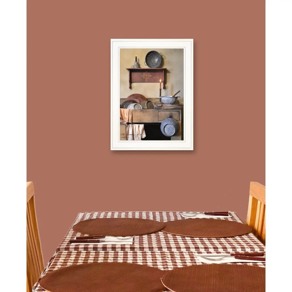 "The Kitchen Sink" is by Artist Billy Jacobs. This framed wall art features a very simple but beautiful still life image of a vintage washing station. The different type of strainers and cooking items are all cleaned and drying after a day's work. The candle resting on the top of the cutting board shines brightly over the busy work area. Our products are proudly made by skilled American workers. The surface of our framed art is textured with a fade resistant coating, so no glass is necessary. A vegetable-based glue is used in the production of our products, and our frames are crafted from 100% recycled material. In keeping with our environmentally friendly approach towards manufacturing. Arrives ready to hang