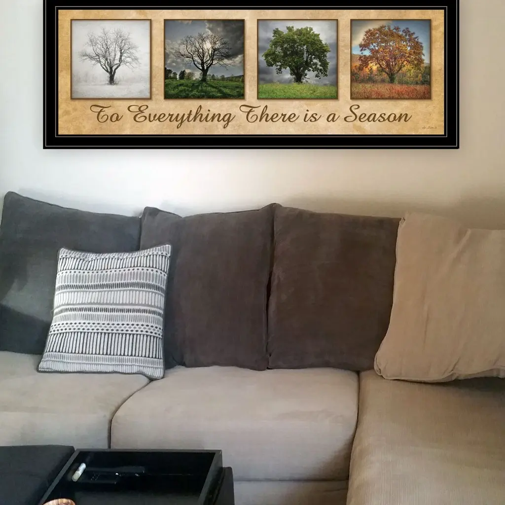 LD371-704G "There is a Season" by Lori Deiter. This black framed print (39x15) see the beauty of nature in this print; print shows the trees changing in every season. The beauty of winter; yes, there is beauty beyond snow shoveling! Spring storms bring on renewed growth from the rain, the beauty of the leaves arriving, and the reminder in the fall of leaves changing telling us to get ready for the winter. The surface of the print is textured with a fade resistant coating so no glass is necessary. Arrives ready to hang. Made in the USA by skilled American workers.
