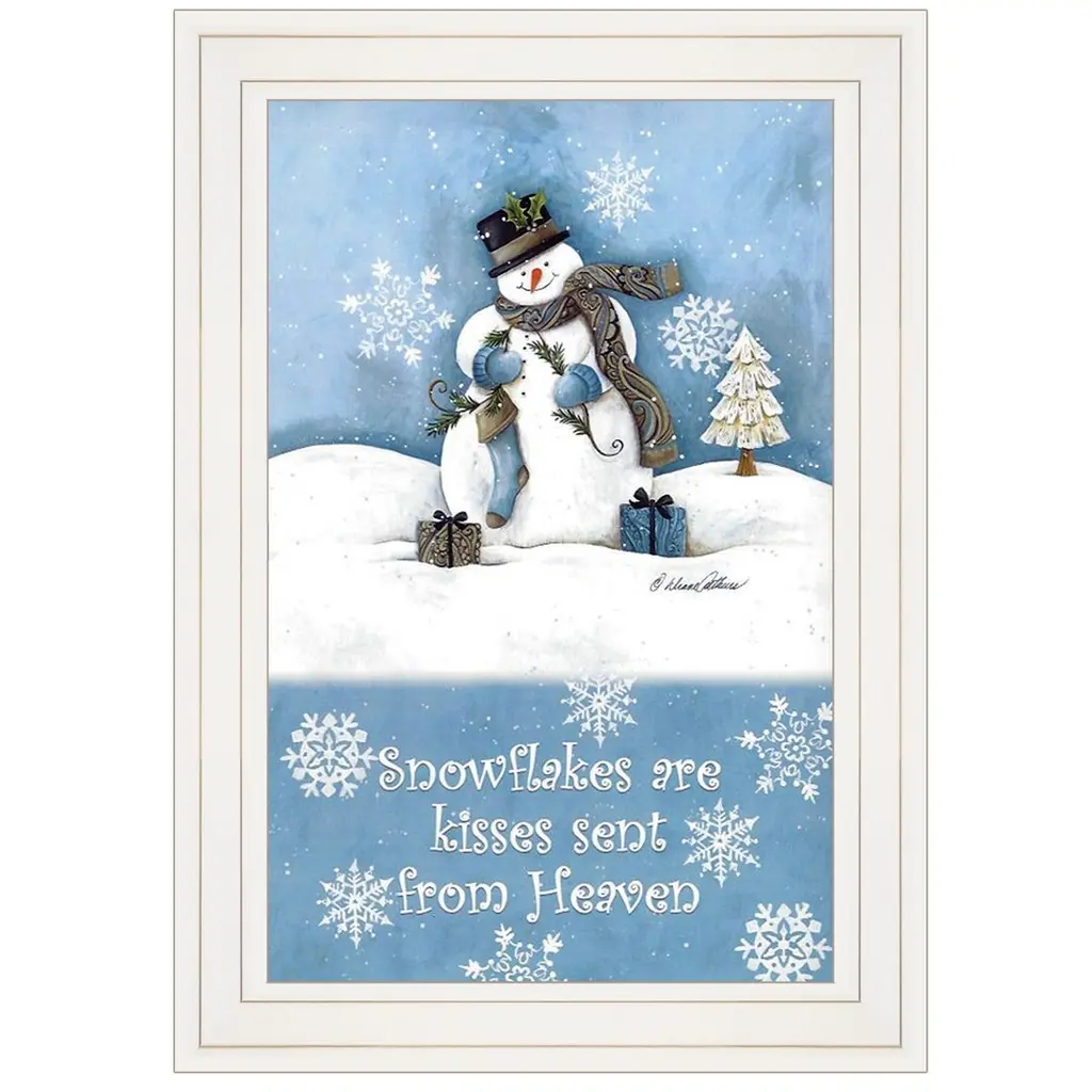 ART629A-226G "Trendy Snowman" is a 11"x15" white framed art print by Diane Arthur. This artwork features a snowman with a hat, scarf and present with snowflakes in the background and the words snowflakes are kisses sent from heaven. This totally American Made wall decor item features an decorative white frame. The framed art print has a protective, archival finish (glass is not needed) and arrives ready to hang.