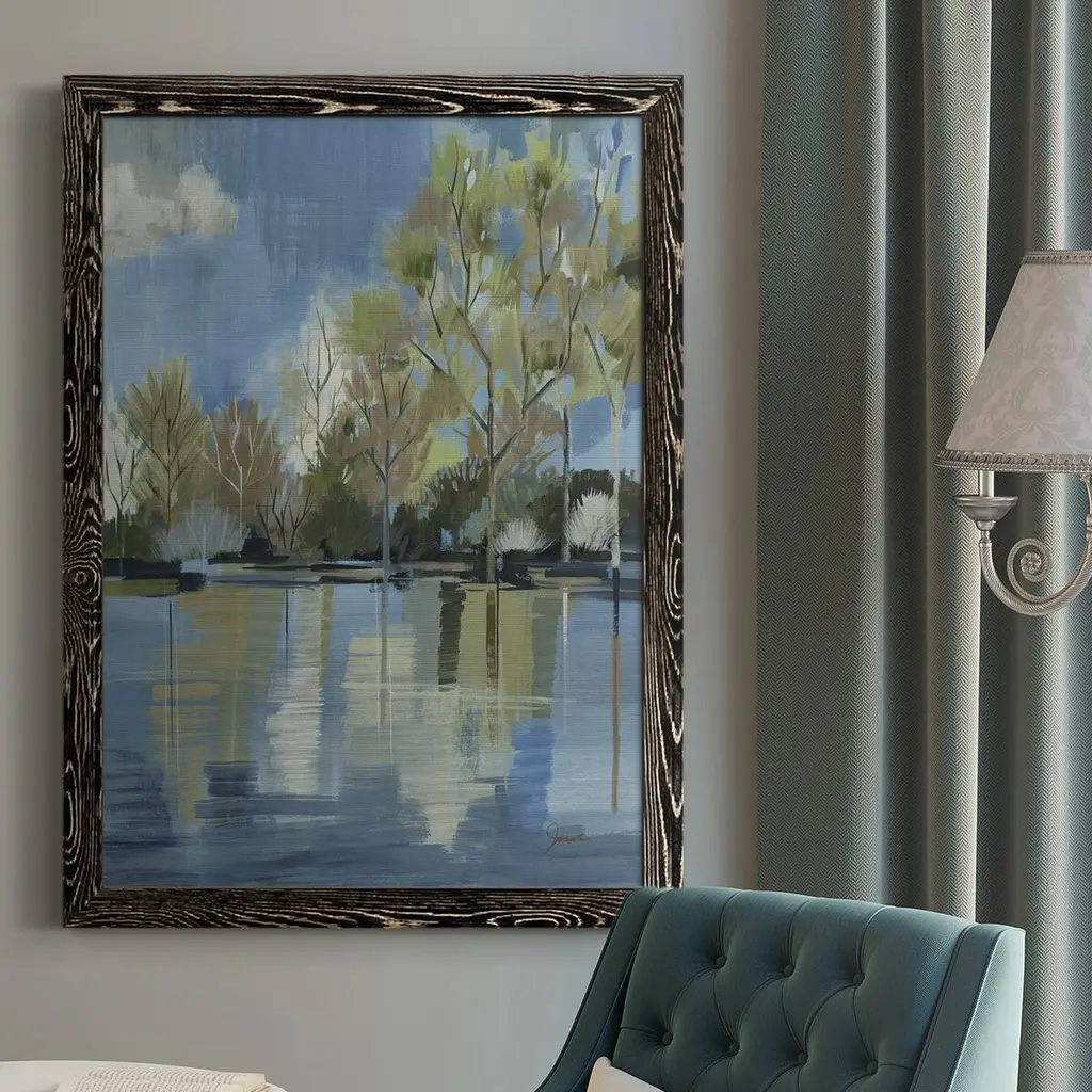 "Lake Reflections " is by Artisan Bluebird Barn. Framed print of a peaceful treelined with mountains in the background and a reflections of a tree line in the waters edge. Our products are proudly made by skilled American workers. The surface of our framed art is textured with a fade resistant coating, so no glass is necessary. A vegetable-based glue is used in the production of our products, and our frames are crafted from 100% recycled material, in keeping with our environmentally friendly approach toward manufacturing. Arrives ready to hang. Crafted with utmost care and precision by skilled American crafters, this artwork is a testament to their unwavering commitment to quality. Each brushstroke exudes passion and dedication, bringing the scene to life in vivid detail. The fade-resistant texture coating ensures that the vibrant colors will remain intact, preserving the canvas-like appearance for years to come. Investing in a piece that is truly one-of-a-kind. No other artwork can capture the same blend of tranquility, elegance, and wanderlust. It is a testament to your discerning taste and appreciation for the beauty that nature and art can conjure together. Brought to you by Continents Apart.