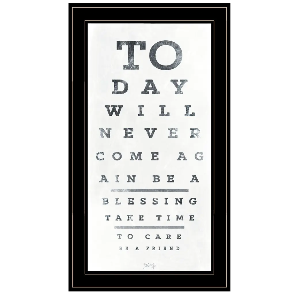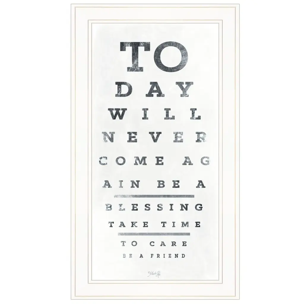 MAZ5265-704G "Eye Chart I" by artisan by Marla Rae. This decorative framed print 15"x27" of a eye chart will be a conversational piece for any home; take time to read the encouraging word of inspiration on the chart: Today will never come again, be a blessing, take time to care, be a friend. Our products are proudly made by skilled American workers. The surface of our framed art is textured with a fade resistant coating, so no glass is necessary. A vegetable-based glue is used in the production of our products, and our frames are crafted from 100% recycled material. In keeping with our environmentally friendly approach toward manufacturing. To view a 2-piece vignette, including this print, please search: V605-704G