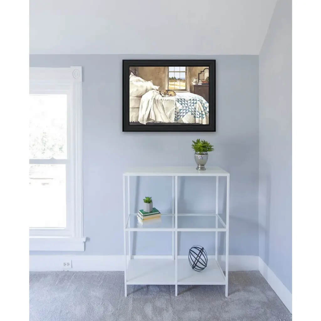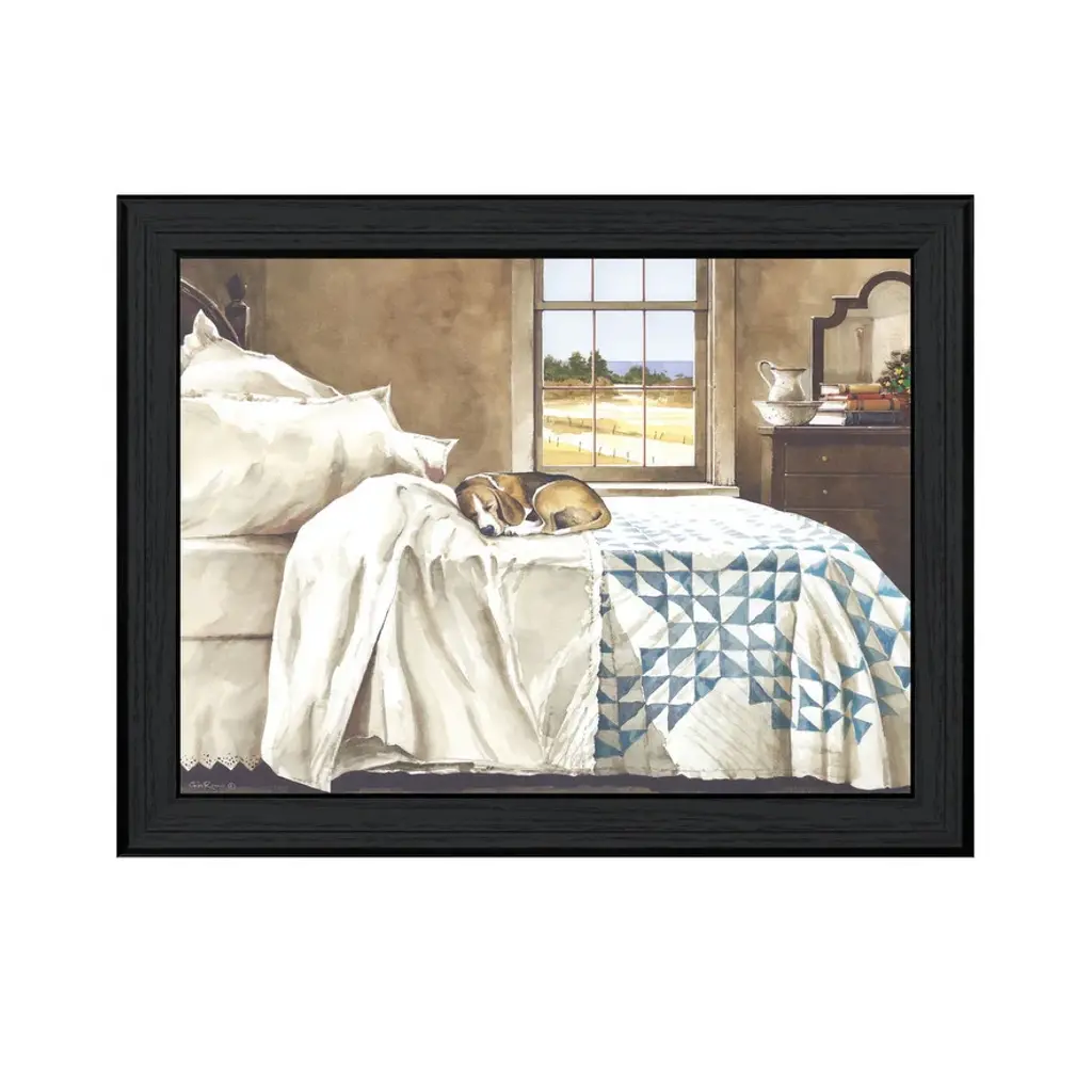 JR194-712 "Home Alone" is by artisan John Rossini. This print features a rustic country bedroom setting. The bed is a messy made with the blue patch work quilt pulled tightly over it. A sleeping beagle all snuggled up resting on top of the bed. On the dresser there is a water pitcher resting along with a handful of books. Looking out the window the sunshine is shining in give the room the golden glow. Our products are proudly made by skilled American workers. The surface of our framed art is textured with a fade resistant coating, so no glass is necessary. A vegetable-based glue is used in the production of our products, and our frames are crafted from 100% recycled material, In keeping with our environmentally friendly approach toward manufacturing.