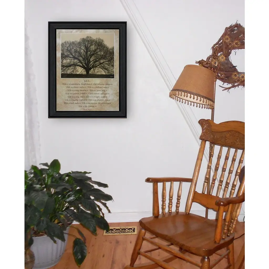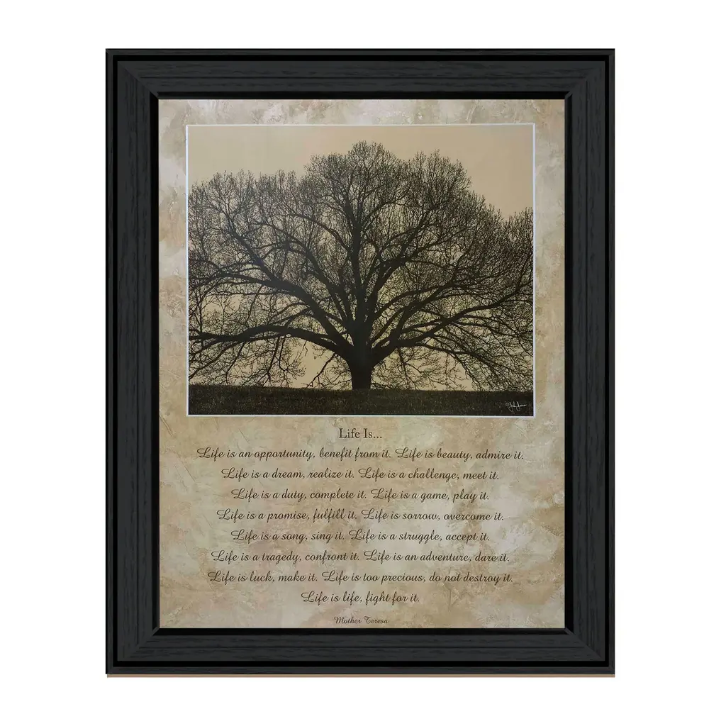 "Life Is" is a framed inspirational framed art print by artist John Jones. This artwork features a prominent image of a Grand Tree on the top half of the presentation. The bottom portion of the piece presents a verse entitled "Life Is" by the exceptional Mother Theresa. Our products are proudly made by skilled American workers. The surface of our framed art is textured with a fade resistant coating, so no glass is necessary. A vegetable-based glue is used in the production of our products, and our frames are crafted from 100% recycled material. In keeping with our environmentally friendly approach toward manufacturing.