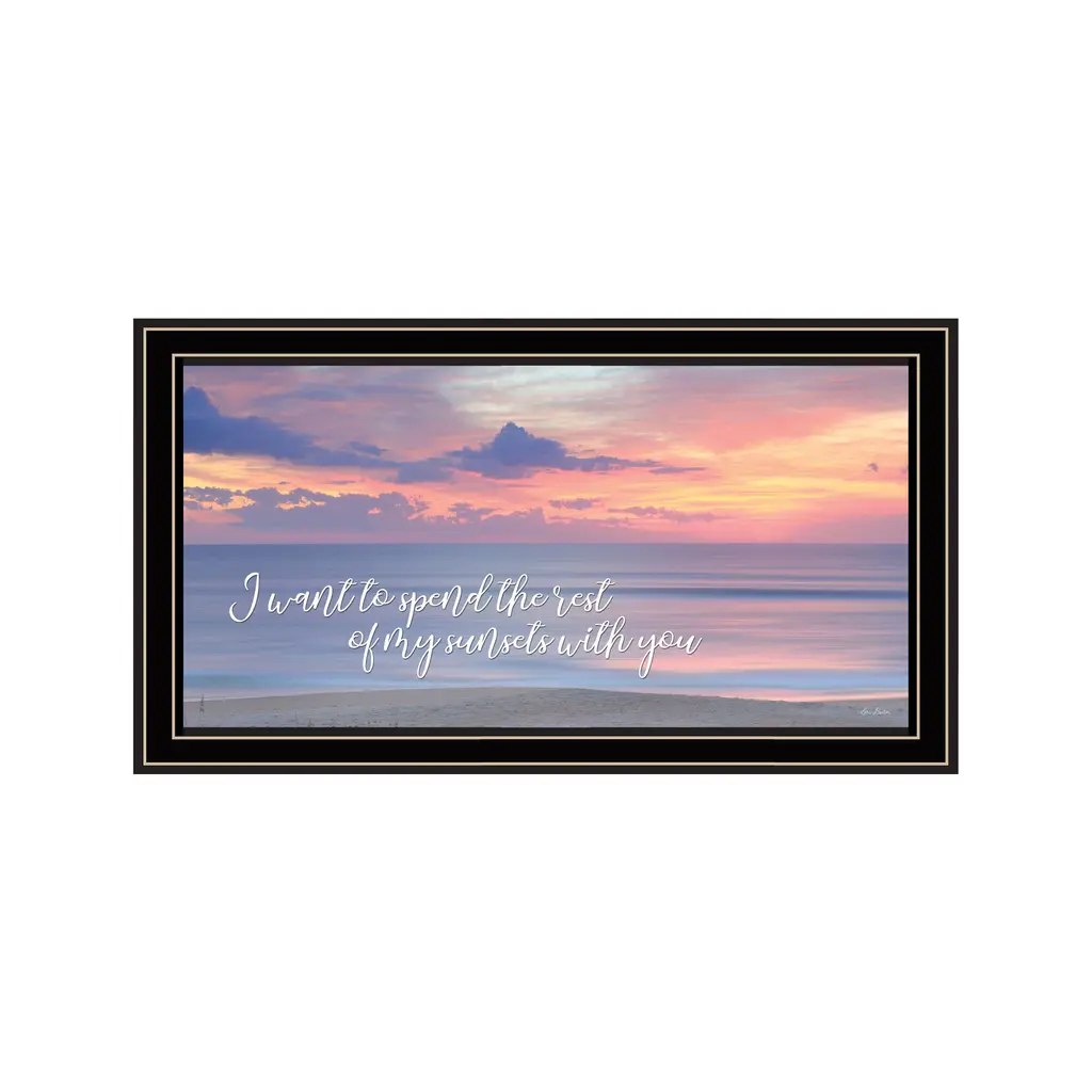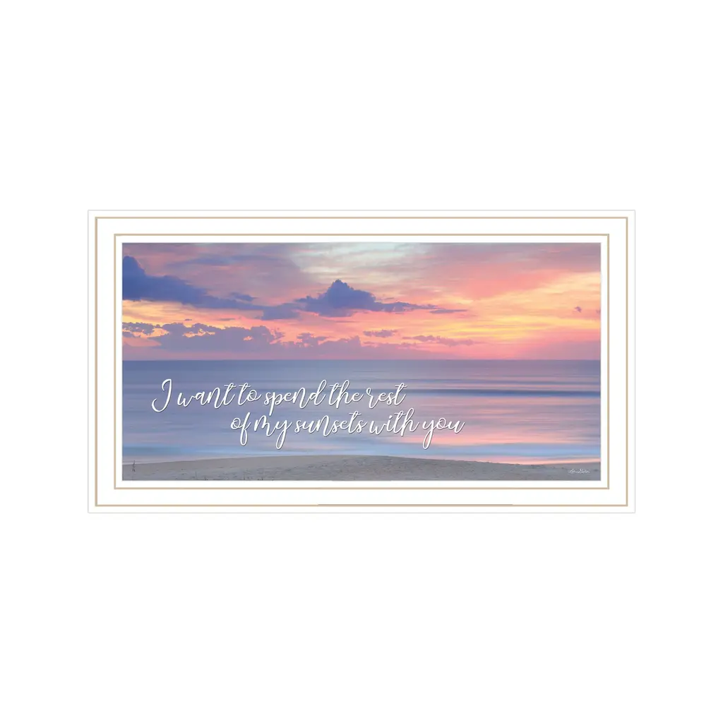 "Rest of My Sunsets I" is by Artisan Lori Deiter. I want to spend the rest of my sunsets with you! Come and enjoy our life. Our products are proudly made by skilled American workers. The surface of our framed art is textured with a fade resistant coating, so no glass is necessary. A vegetable-based glue is used in the production of our products, and our frames are crafted from 100% recycled material, in keeping with our environmentally friendly approach toward manufacturing. Arrives ready to hang. Crafted with utmost care and precision by skilled American crafters, this artwork is a testament to their unwavering commitment to quality. Each brushstroke exudes passion and dedication, bringing the scene to life in vivid detail. The fade-resistant texture coating ensures that the vibrant colors will remain intact, preserving the canvas-like appearance for years to come. Investing in a piece that is truly one-of-a-kind. No other artwork can capture the same blend of tranquility, elegance, and wanderlust. It is a testament to your discerning taste and appreciation for the beauty that nature and art can conjure together. Brought to you by Continents Apart.