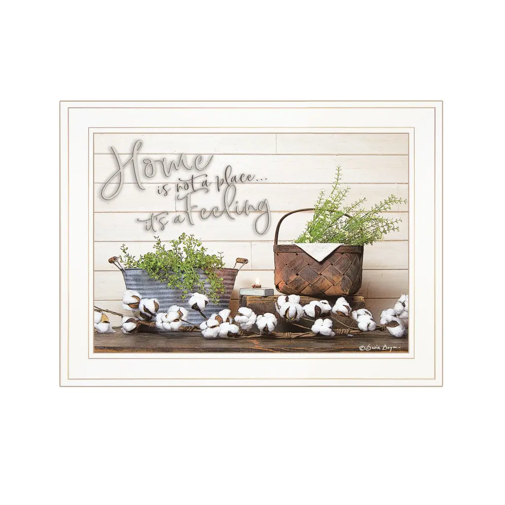 "Home is not a Place" is by Artisan Susan Boyer. This decorative framed wall art features still life with script that reads "Home is not a Place it's a Feeling" with shiplap, baskets, plants, cotton, and galvanized bucket. Our products are proudly made by skilled American workers. The surface of our framed art is textured with a fade resistant coating, so no glass is necessary. A vegetable-based glue is used in the production of our products, and our frames are crafted from 100% recycled material. In keeping with our environmentally friendly approach towards manufacturing. Arrives ready to hang