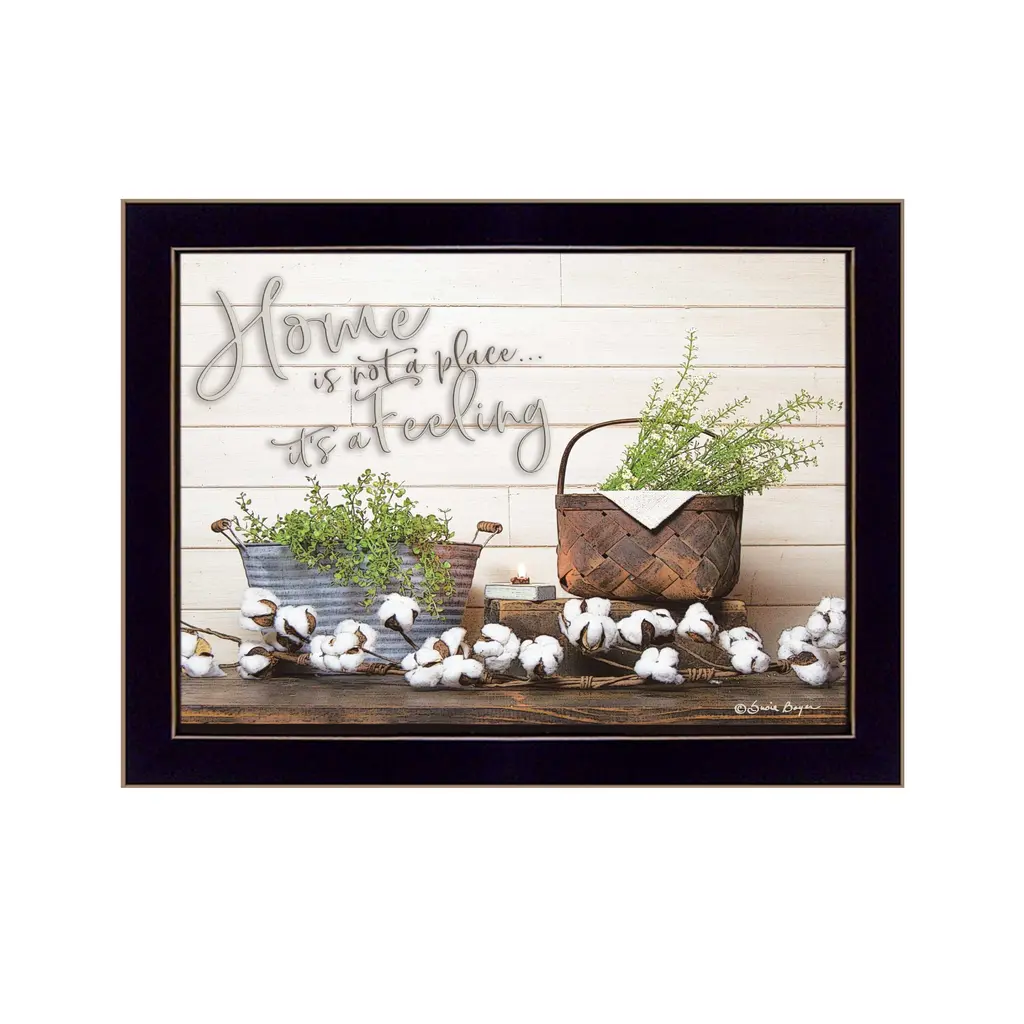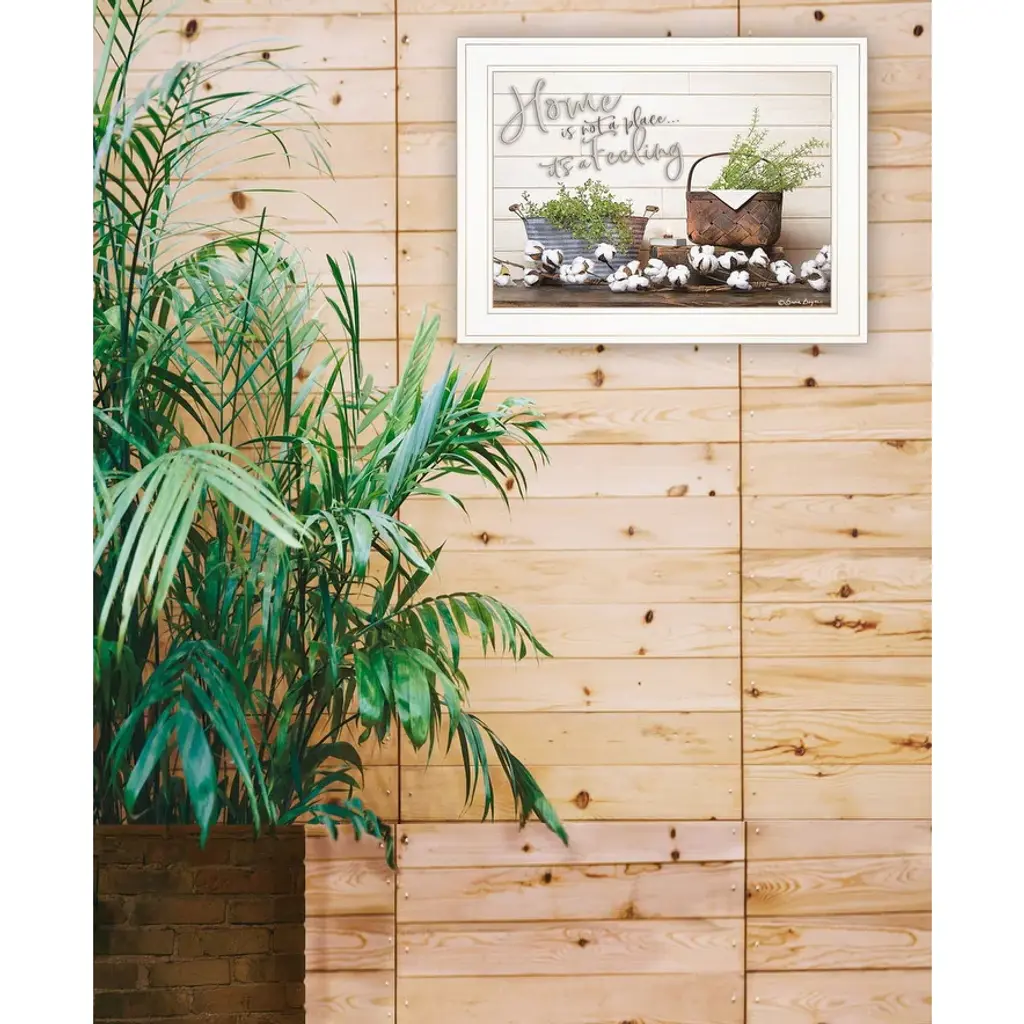 "Home is not a Place" is by Artisan Susan Boyer. This decorative framed wall art features still life with script that reads "Home is not a Place it's a Feeling" with shiplap, baskets, plants, cotton, and galvanized bucket. Our products are proudly made by skilled American workers. The surface of our framed art is textured with a fade resistant coating, so no glass is necessary. A vegetable-based glue is used in the production of our products, and our frames are crafted from 100% recycled material. In keeping with our environmentally friendly approach towards manufacturing. Arrives ready to hang