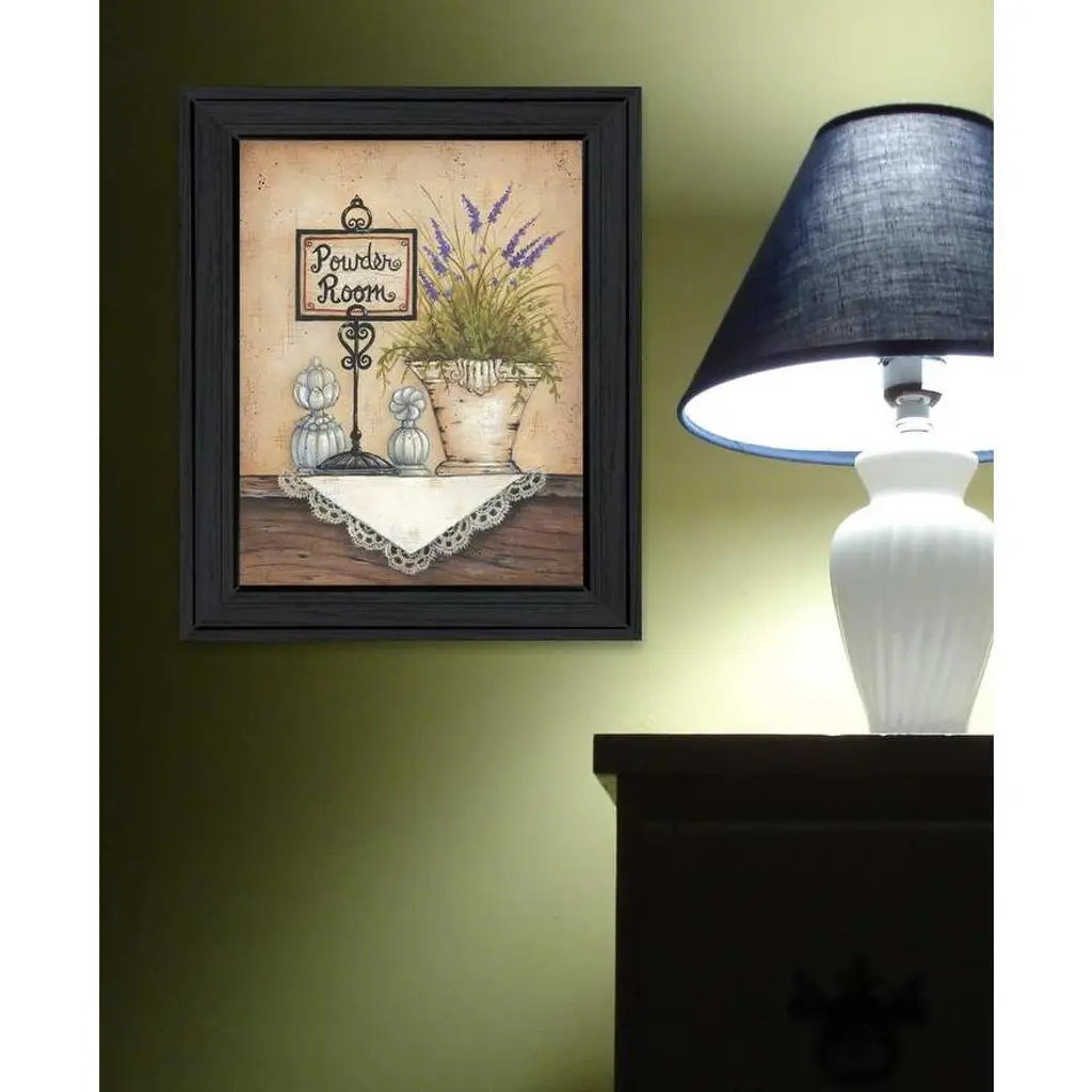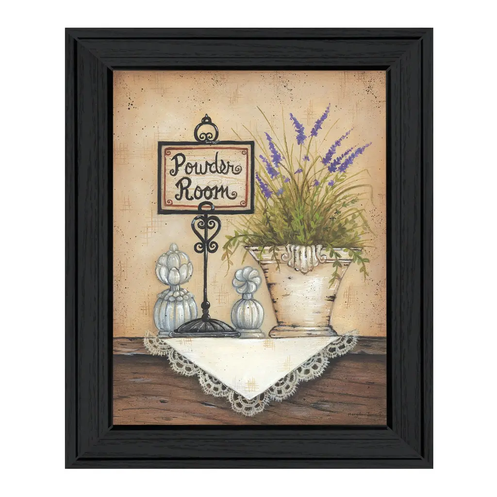 "Powder Room" is by Artisan Mary Ann June. This decorative black framed wall art wrought iron stand with a artful sign saying "Powder Room". This vintage flower pot with lavender, and dolly draping off the shelf. Our products are proudly made by skilled American workers. The surface of our framed art is textured with a fade resistant coating, so no glass is necessary. A vegetable-based glue is used in the production of our products, and our frames are crafted from 100% recycled material. In keeping with our environmentally friendly approach towards manufacturing. Arrives ready to hang.