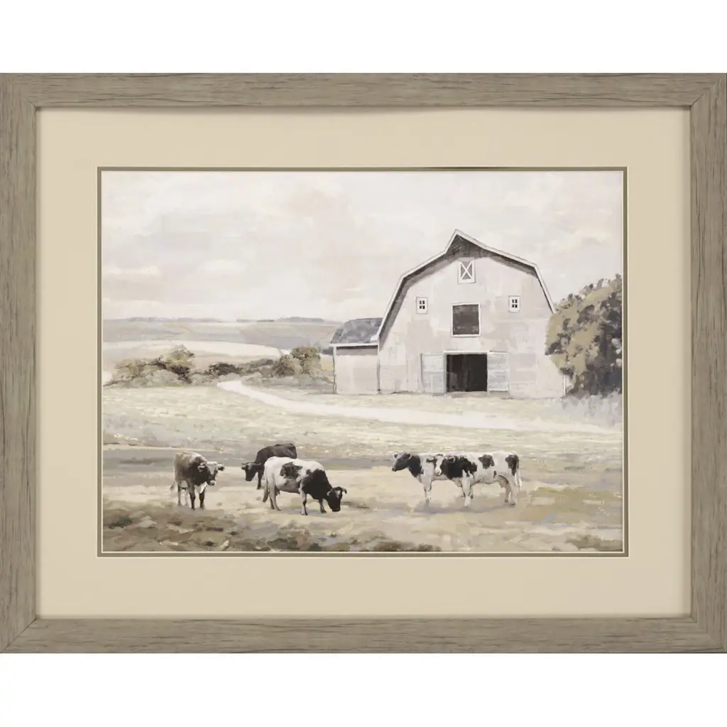 "Stone Barn" is a 19" x 15" black framed art print Pam Britton . This artwork features a stone barn with sheep. This totally American Made wall decor item features an decorative black frame The print has a protective, archival finish (glass is not needed) and arrives ready to hang.