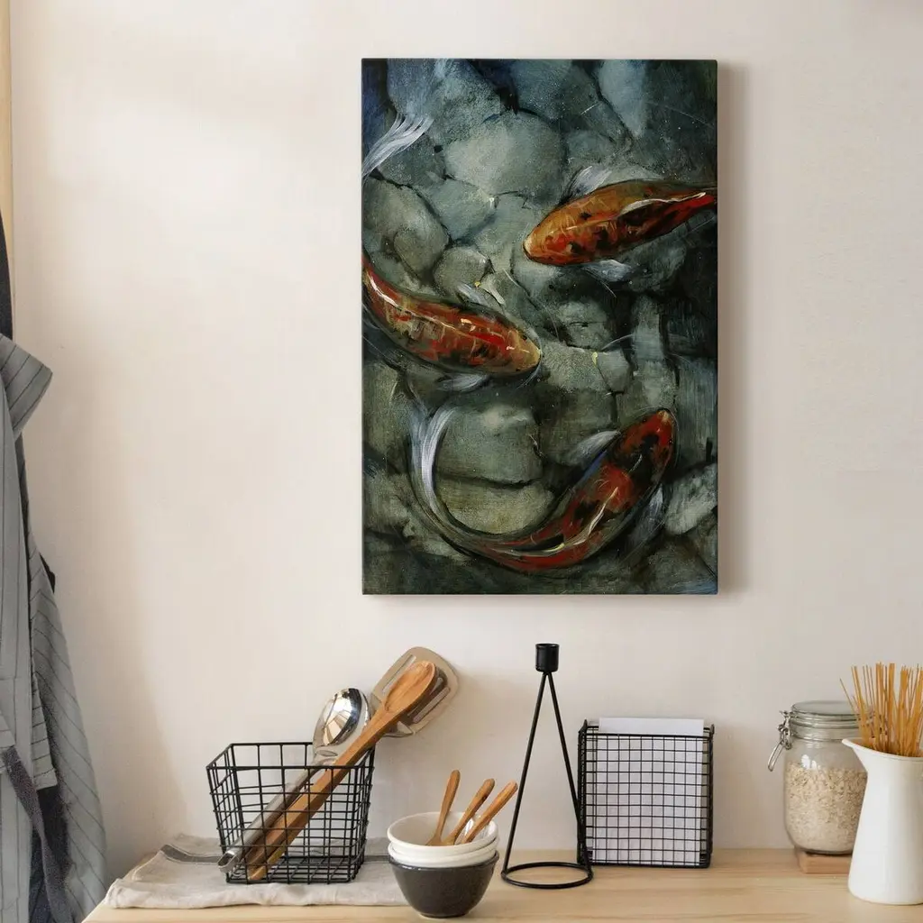 Tres Koi II Premium Gallery Wrapped Canvas - Ready to Hang A premium hand stretched gallery wrapped canvas print created to last. Featuring a beveled a solid wood stretcher bar, each piece comes ready to hand 6 SIZES AVAILABLE 8''X12'' - Overall Size 12''X18'' - Overall Size 18''X27'' - Overall Size 24''x36'' - Overall Size 32''x48'' - Overall Size 40''x60'' - Overall Size Each piece is made to order. Built to Last Each piece comes ready to hang Solid wood stretcher Fade and Water resistant Made domestically