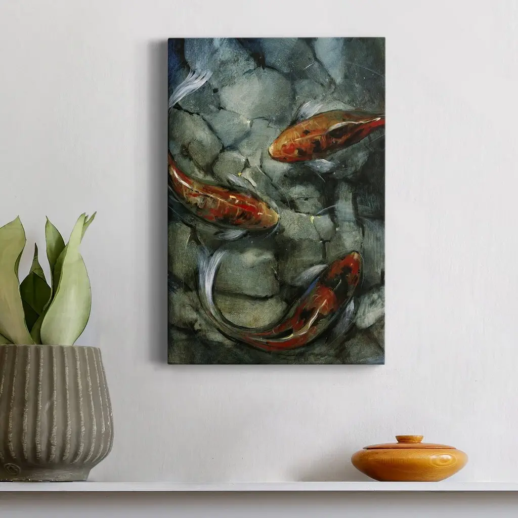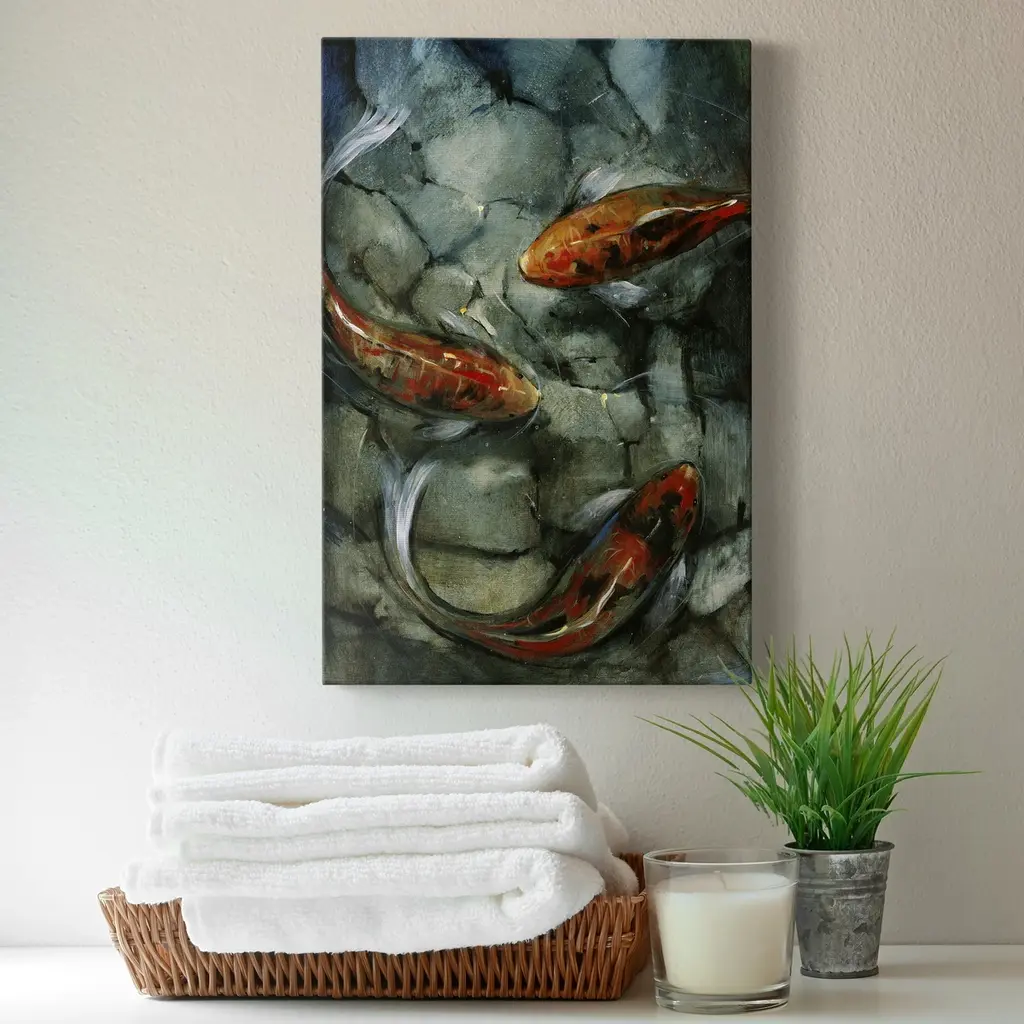 Tres Koi II Premium Gallery Wrapped Canvas - Ready to Hang A premium hand stretched gallery wrapped canvas print created to last. Featuring a beveled a solid wood stretcher bar, each piece comes ready to hand 6 SIZES AVAILABLE 8''X12'' - Overall Size 12''X18'' - Overall Size 18''X27'' - Overall Size 24''x36'' - Overall Size 32''x48'' - Overall Size 40''x60'' - Overall Size Each piece is made to order. Built to Last Each piece comes ready to hang Solid wood stretcher Fade and Water resistant Made domestically