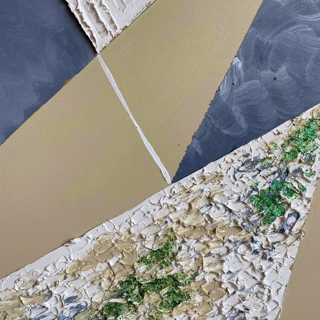 A visually captivating mixed-media artwork created in 2020 by Mascia Meccani, this decorative panel will adorn and enliven a contemporary interior with its dynamic textural quality. The wooden canvas entirely painted and decorated by hand combining contrasting tones and textures, obtained with the addition of sand and stucco to the colors. This piece can be reproduced in different sizes with possible changes in the design due to its handcrafted nature.