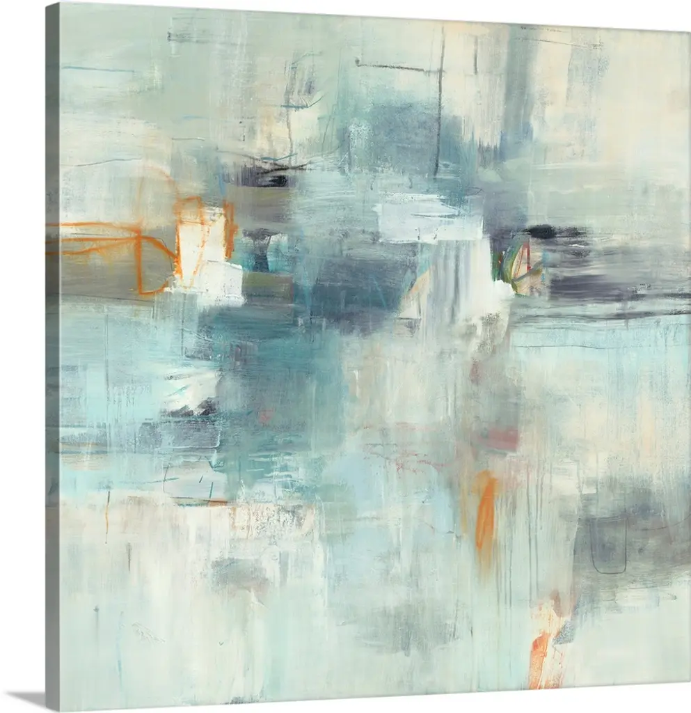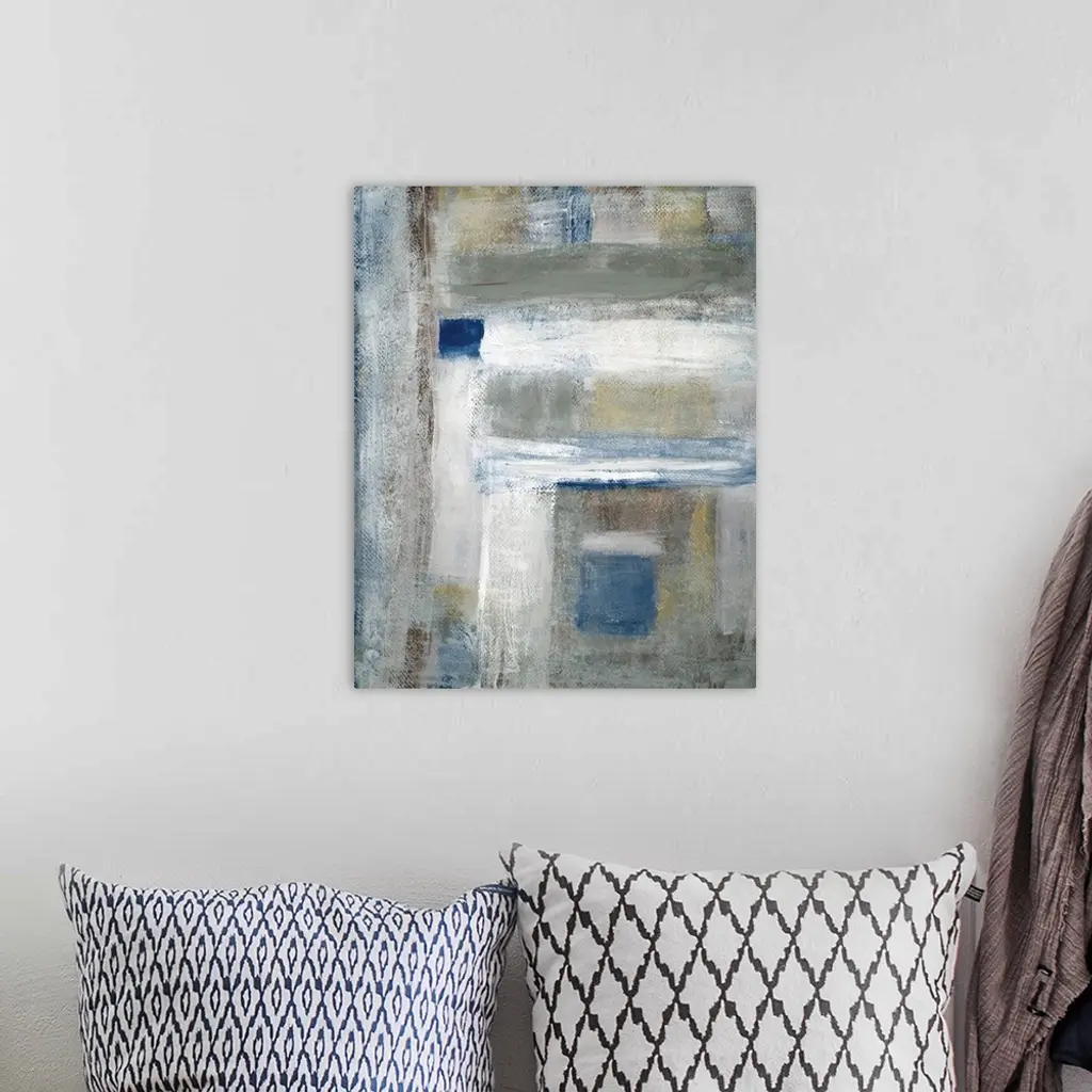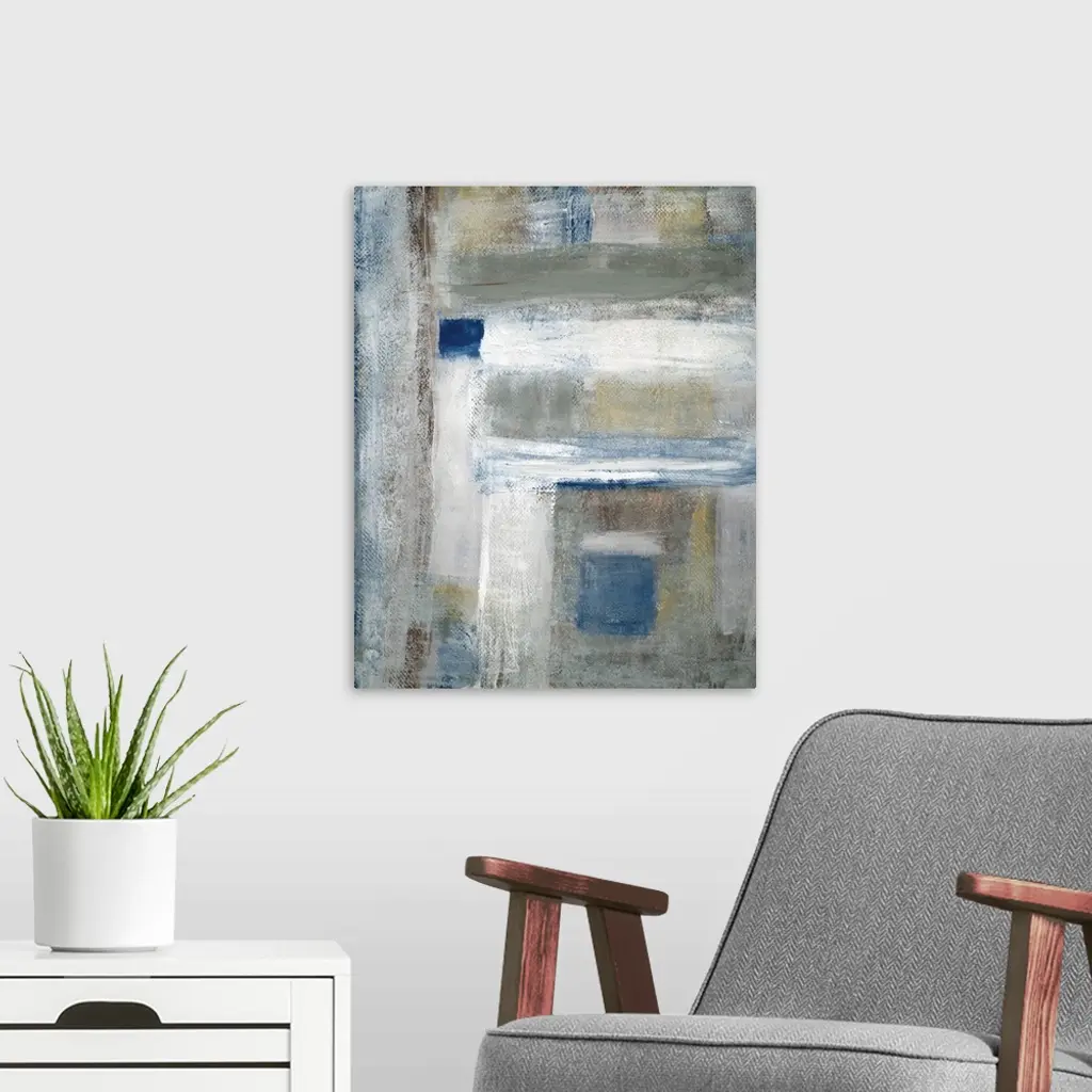 Abstract painting of perpendicular brush strokes in colors of blue, white and gray.