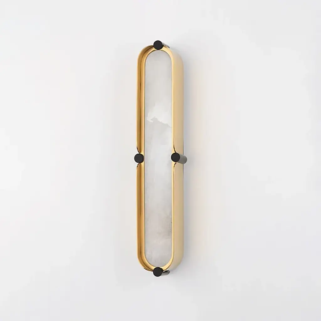 Add the unique and elegant lines of the unforgettable Tribeca LED Vanity Light from Hudson Valley Lighting to your indoor vanity space. A tall oval fixture embellished at each compass point with cylindrical accents provides a two-tone contrast with the sleek frame material, while a piece of Spanish alabaster glows softly inside, embellished by the glow from the fixture’s damp-listed LED. Each piece of alabaster is natural and differs from the others, enabling this piece to stand well as a single statement or as part of a mixed arrangement with subtle variations.