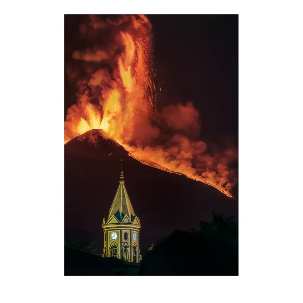 The Etna volcano's eruption on February 10th, 2022 is the powerful, hypnotizing subject of this photographic print. The phenomenon here captured - named triboluminescence and caused by friction that generates electricity - is very rare for the Etna, and depicts lightning emerging from a mix of lapilli, smoke, and lava. It belongs to a ten-piece limited-edition series.