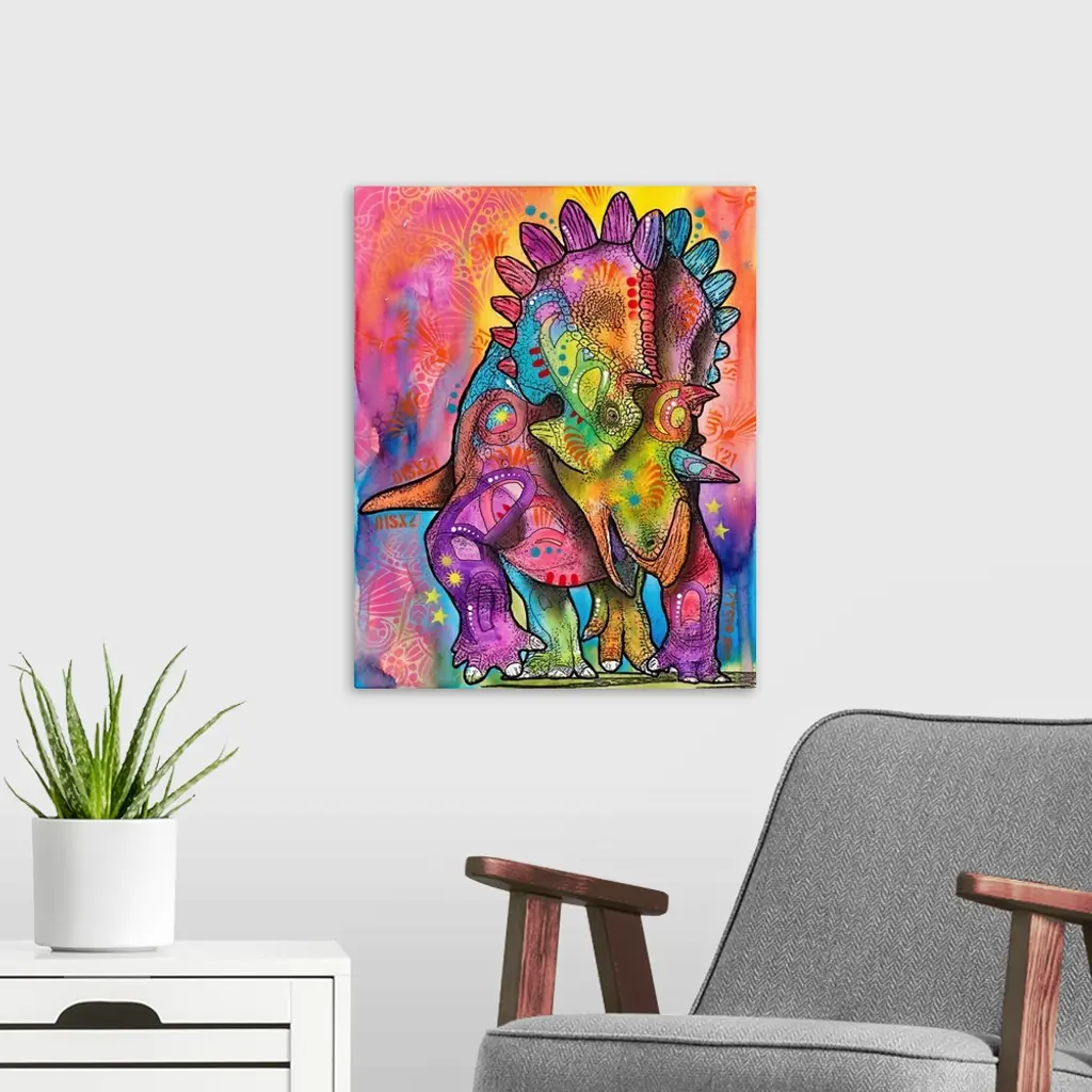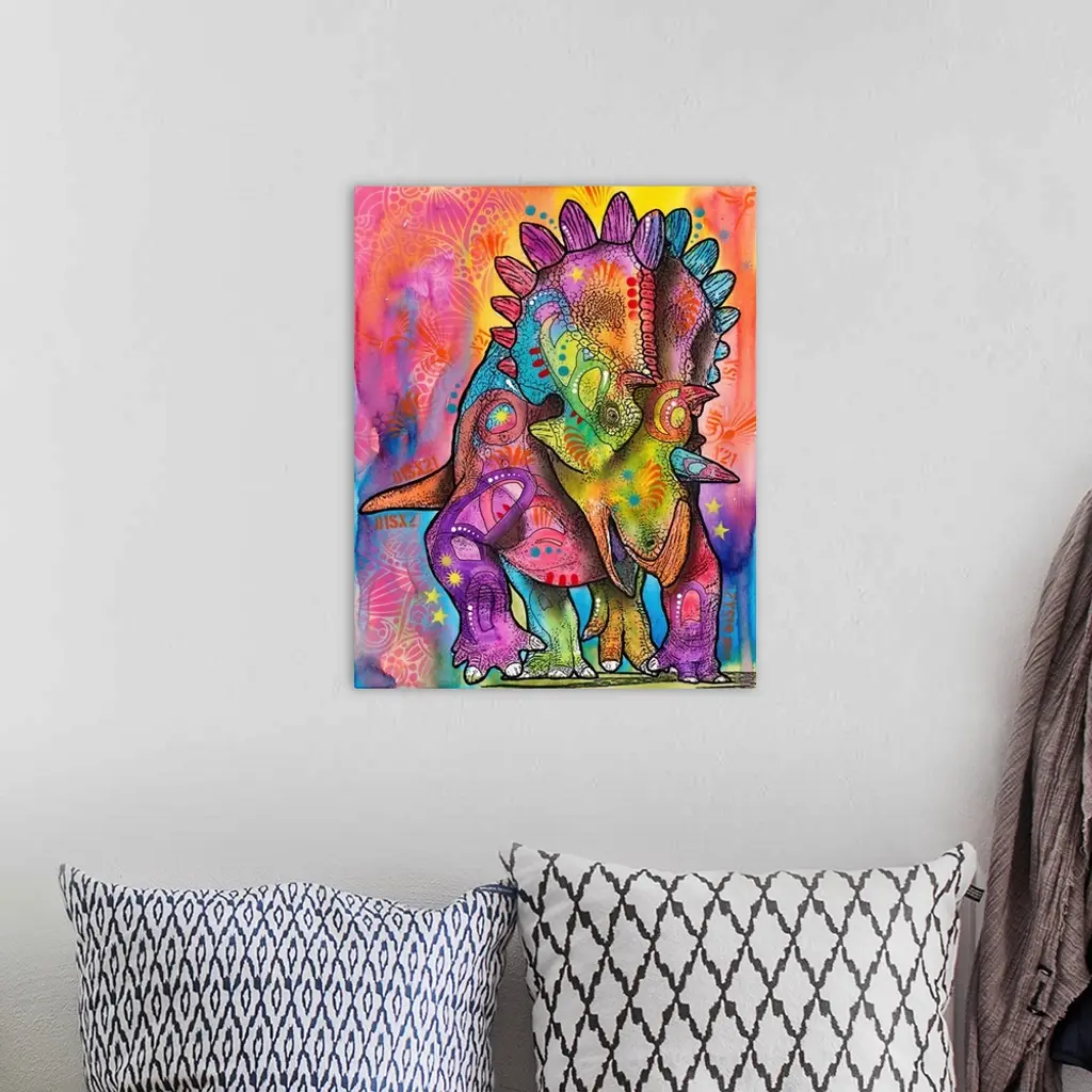 Pop art style painting with a colorful Triceratops with abstract markings all over.