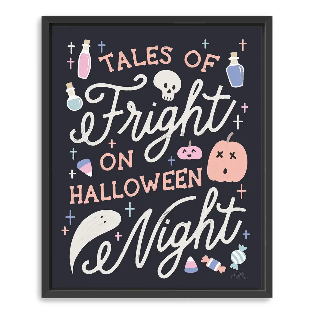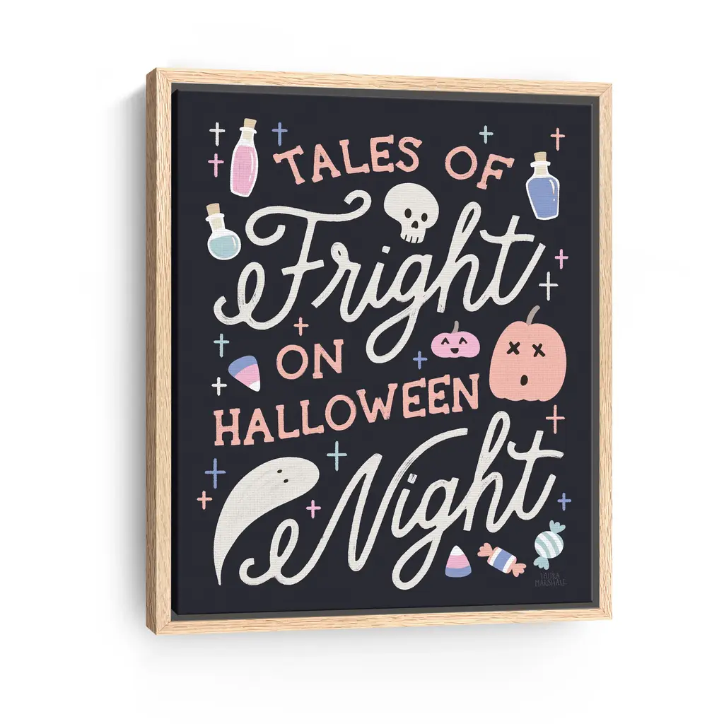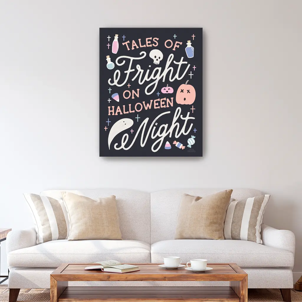 This playful Halloween art combines charming illustrations with the phrase "Tales of Fright on Halloween Night" in flowing script. The mix of candy-colored accents and dark backdrop creates a fun, youthful twist on seasonal decor. Our Gallery Wrap Canvas Prints are proudly assembled with high quality materials in California, USA. Each piece is printed on a thick, archival grade canvas using Giclee technology. It is then hand-stretched by our experienced artisans over solid wood bars, which will not warp over time. The final product is a piece personally crafted for you to confidently display on your wall. Care and Assembly: Ensure that the location of your piece has little to no exposure to heat, sunlight, and moisture. Wipe clean, only if needed. Each piece includes hanging hardware to hang on your wall vertically.