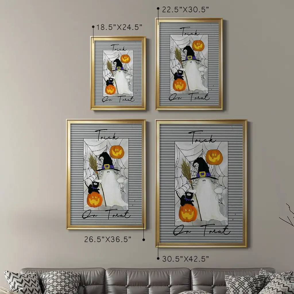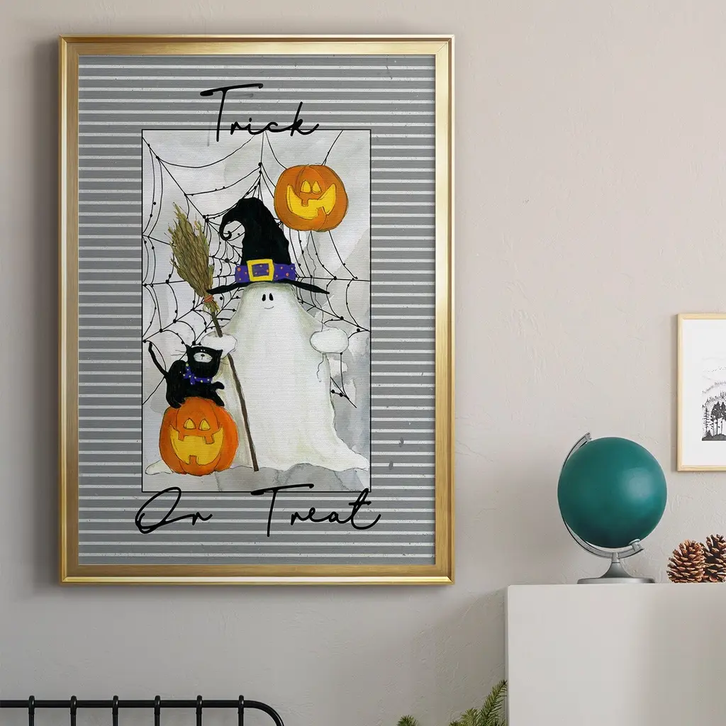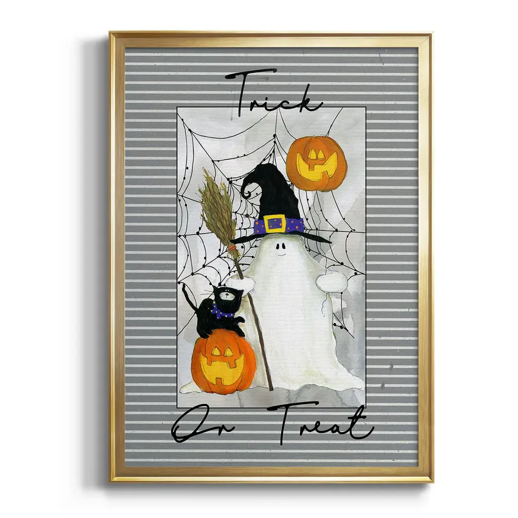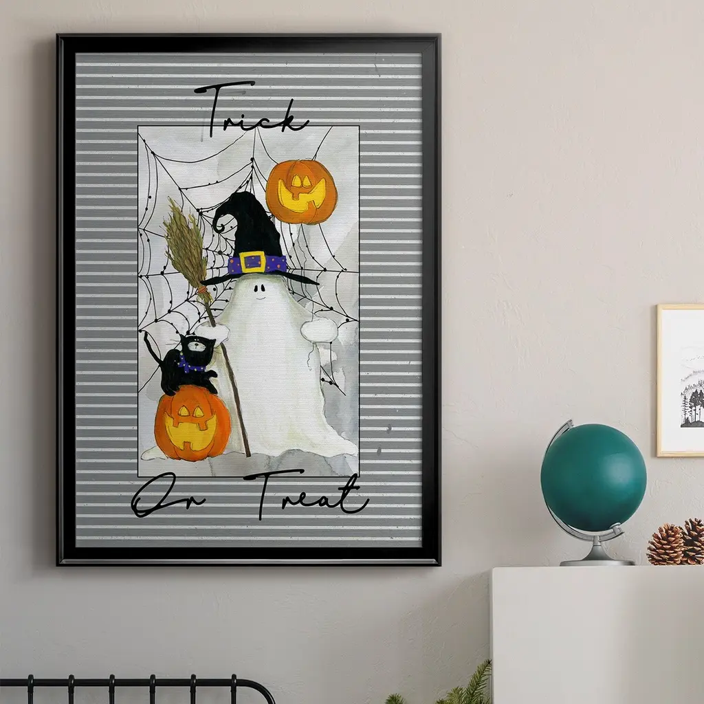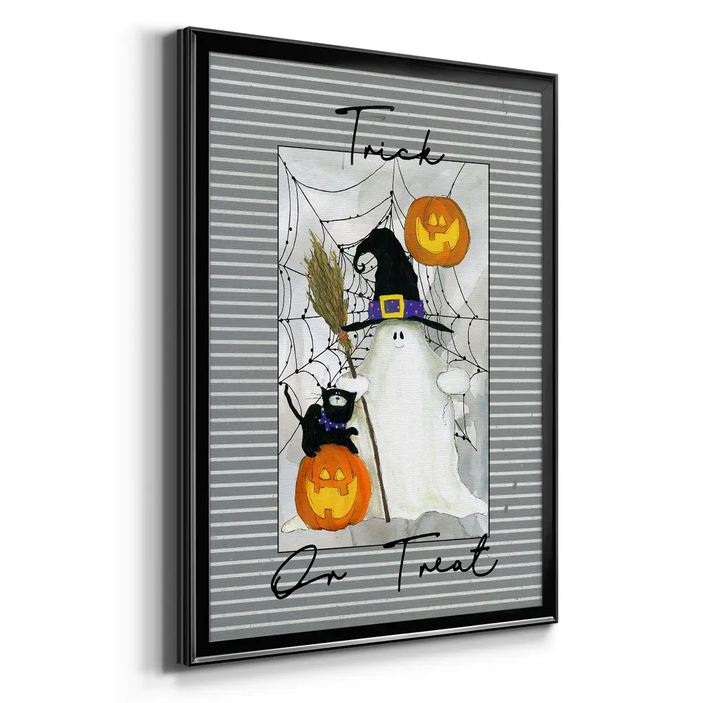 Trick or Treat Ghost Premium Framed Print - Ready to Hang A Premium Framed Print created to last. Framed in distressed wood and available in an array of sizes and colors Featuring a beveled a solid wood stretcher bar, each piece comes ready to hand 4 SIZES AVAILABLE 30.5''X42.5'' - Overall Size 26.5'X36.5'' - Overall Size 22.5''x30.5'' - Overall Size 18.5''x24.5'' - Overall Size Each piece is made to order. Each piece comes with hanging hardware. Made in the USA Ready to Hang
