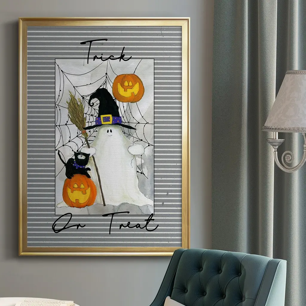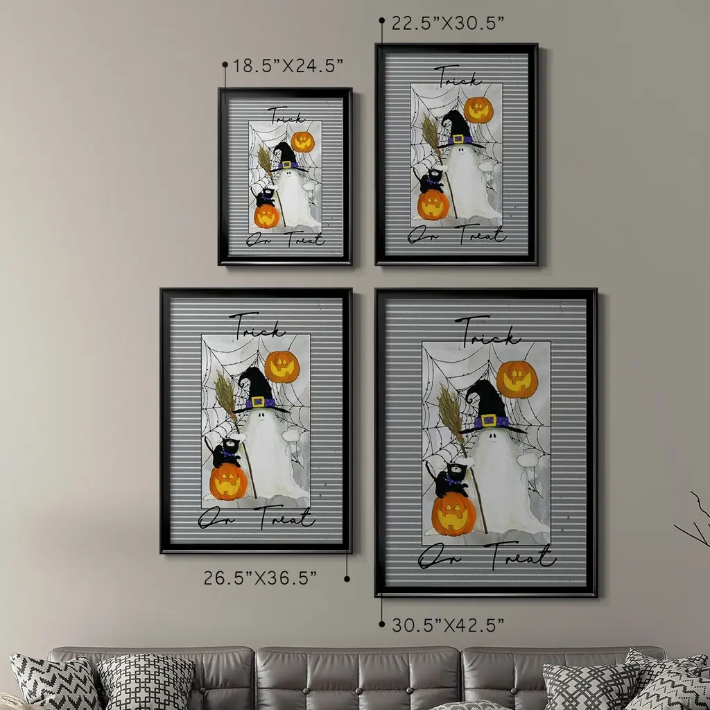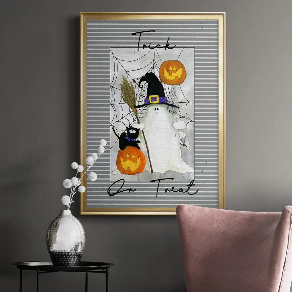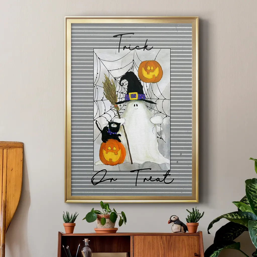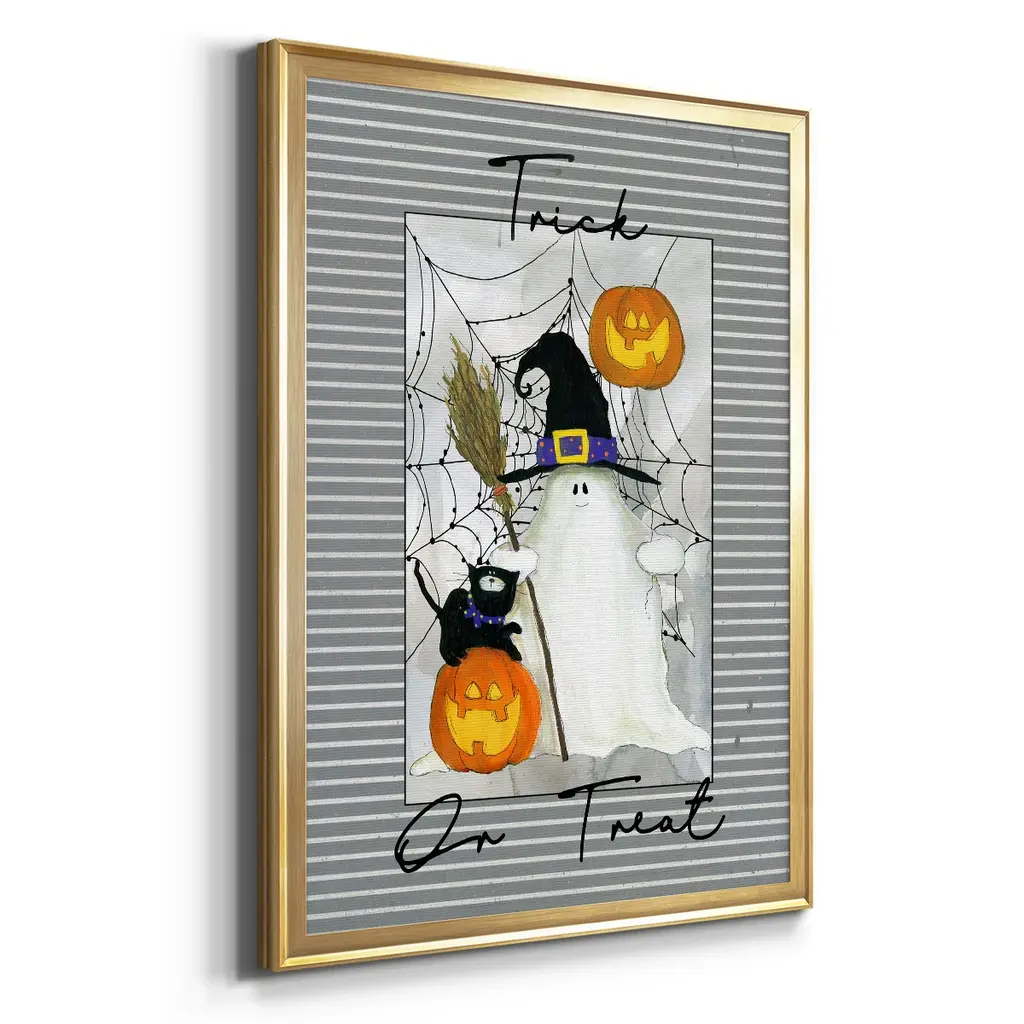 Trick or Treat Ghost Premium Framed Print - Ready to Hang A Premium Framed Print created to last. Framed in distressed wood and available in an array of sizes and colors Featuring a beveled a solid wood stretcher bar, each piece comes ready to hand 4 SIZES AVAILABLE 30.5''X42.5'' - Overall Size 26.5'X36.5'' - Overall Size 22.5''x30.5'' - Overall Size 18.5''x24.5'' - Overall Size Each piece is made to order. Each piece comes with hanging hardware. Made in the USA Ready to Hang