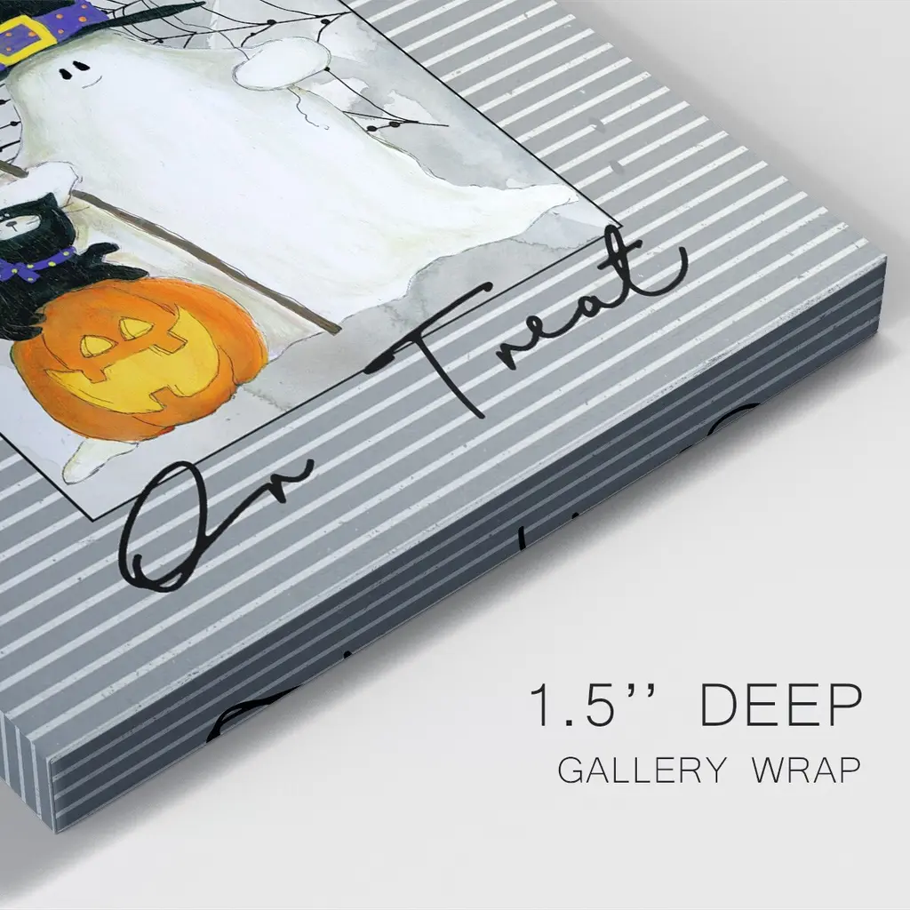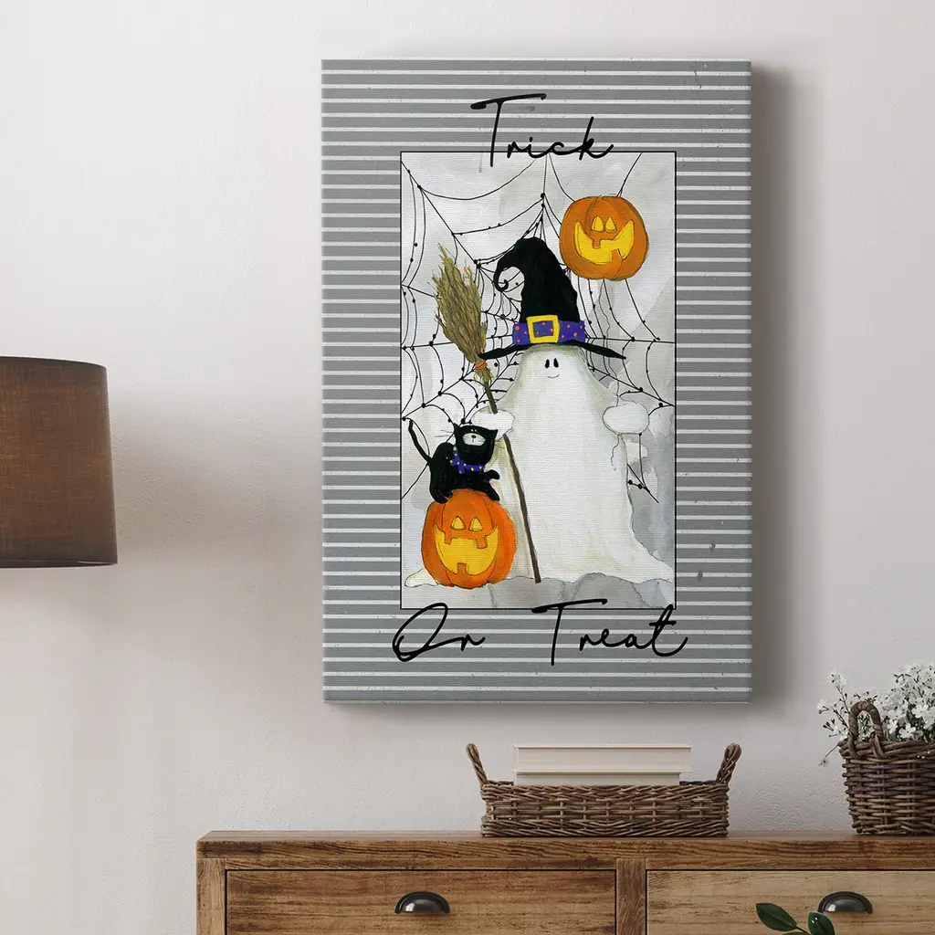 Trick or Treat Ghost Premium Gallery Wrapped Canvas - Ready to Hang A premium hand stretched gallery wrapped canvas print created to last. Featuring a beveled a solid wood stretcher bar, each piece comes ready to hand 6 SIZES AVAILABLE 8''X12'' - Overall Size 12''X18'' - Overall Size 18''X27'' - Overall Size 24''x36'' - Overall Size 32''x48'' - Overall Size 40''x60'' - Overall Size Each piece is made to order. Built to Last Each piece comes ready to hang Solid wood stretcher Fade and Water resistant Made domestically
