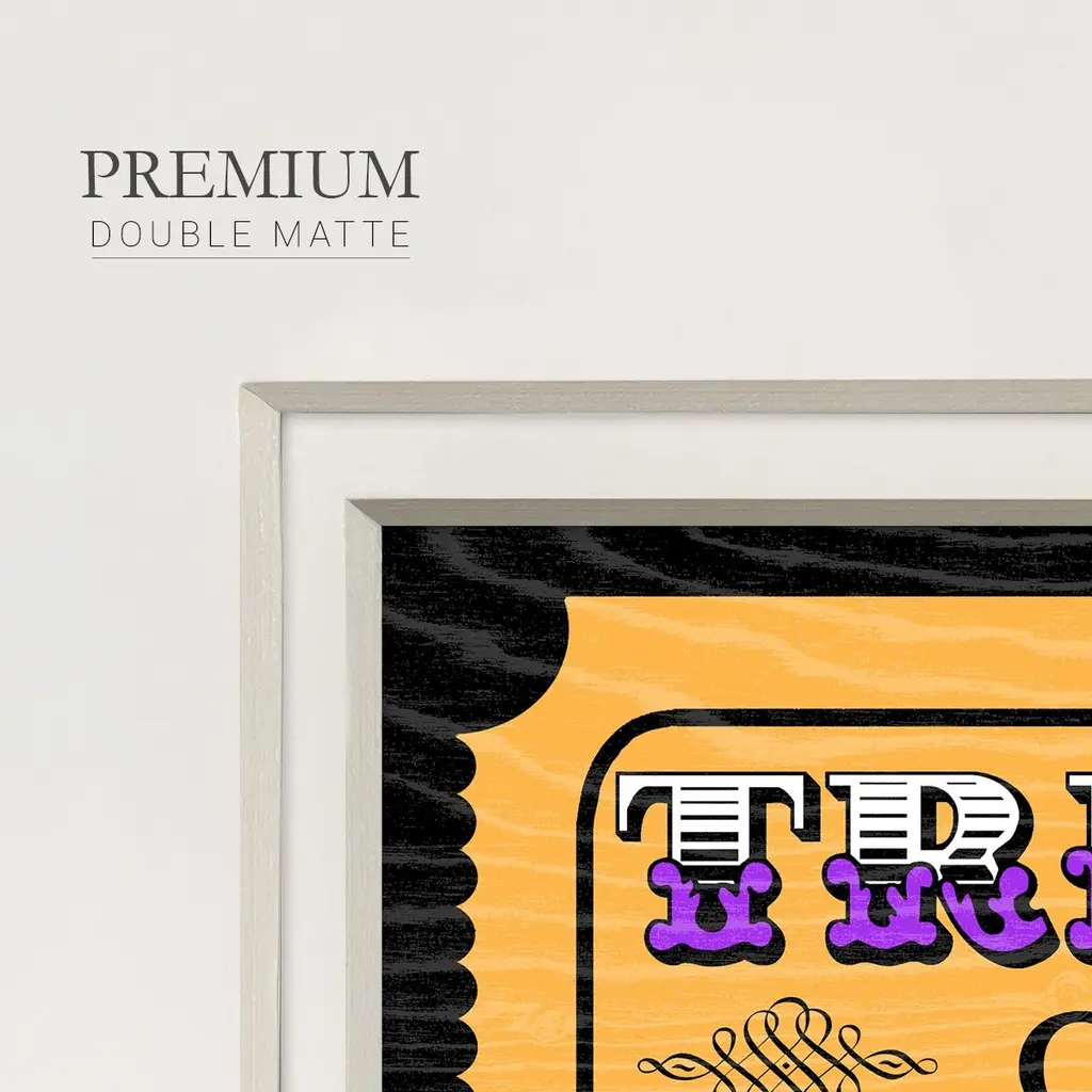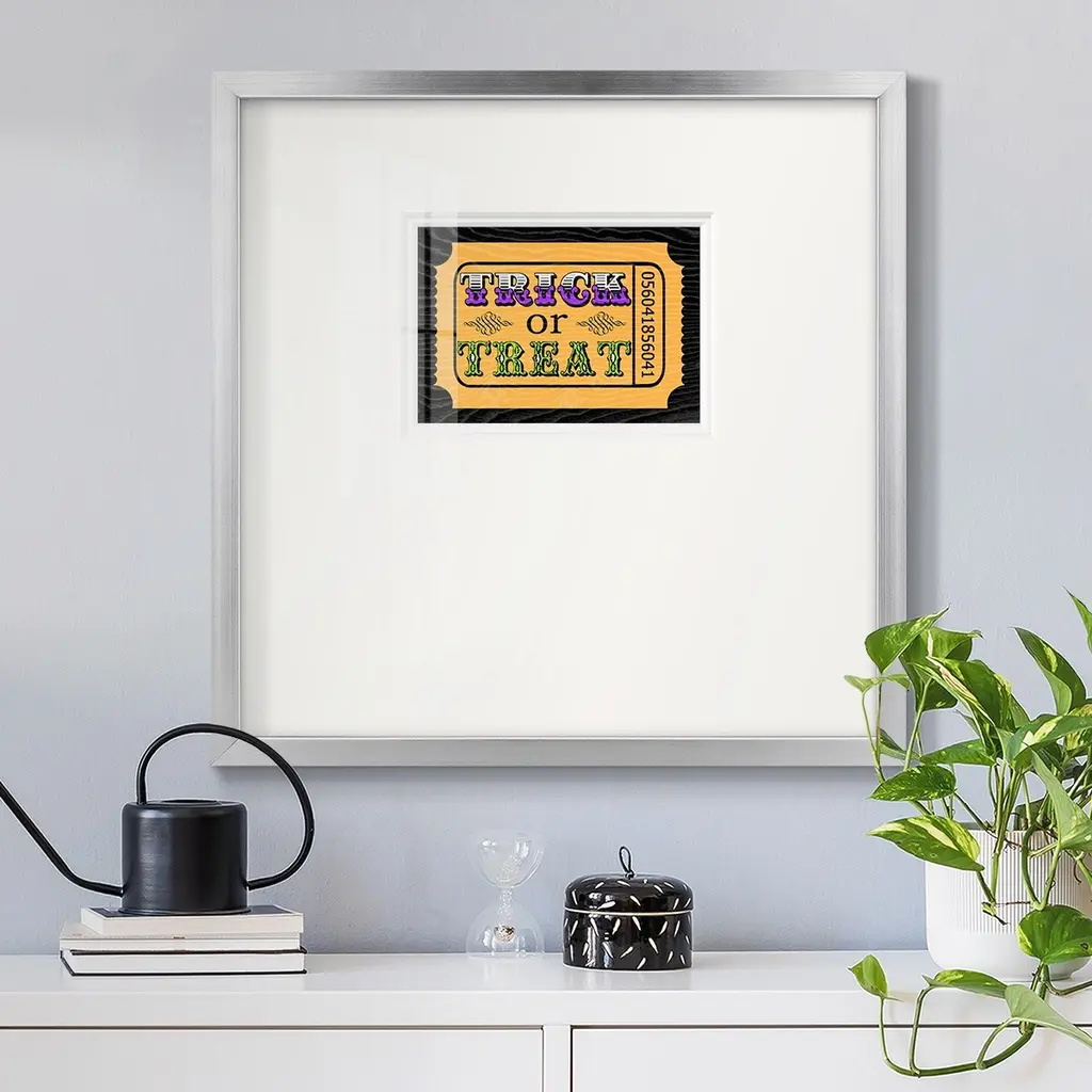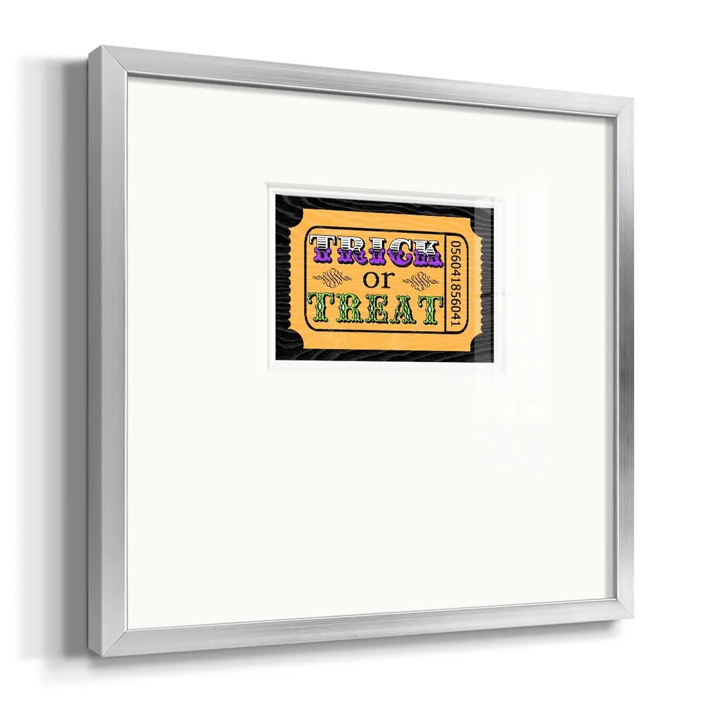 Trick or Treat TicketPremium Framed Print A framed cold pressed paper print featuring superior double matting and quality frame. 2 SIZES AVAILABLE 16''X16''' - Overall Size 20''X20''' - Overall Size Each piece is made to order. Each piece comes with hanging hardware. Made in the USA Ready to Hang Giclee Paper Print Plexiglass Beveled Matt Board Double Matte Board