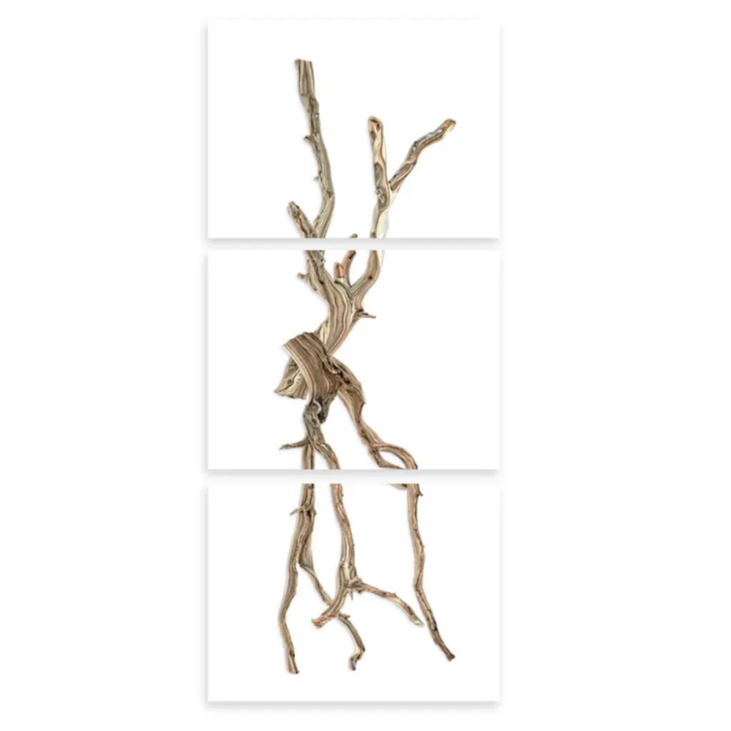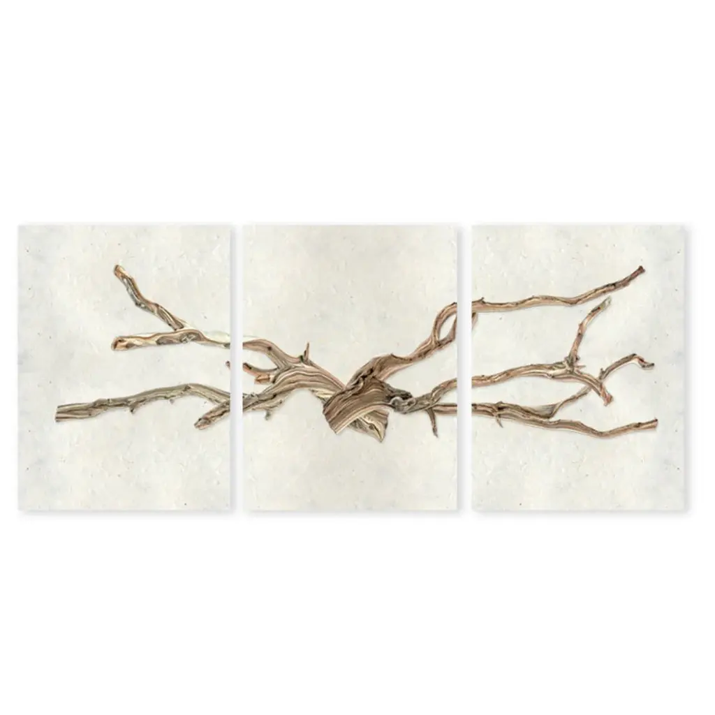Inspired by the lore and relationship between water and wood, forest and sea, a study of driftwood and it's intricacies are expertly crafted. Art pieces can either be unframed (print only), or framed in a choice of archival wood frames. If unframed, a choice of adding a “frameless” leather + steel hanger is available. The added-on hanger is shipped disassembled from the artwork. This hanging kits come complete with everything needed to hang the triptych prints, including easy instructions. No damage is done to the print upon utilizing the hangers.