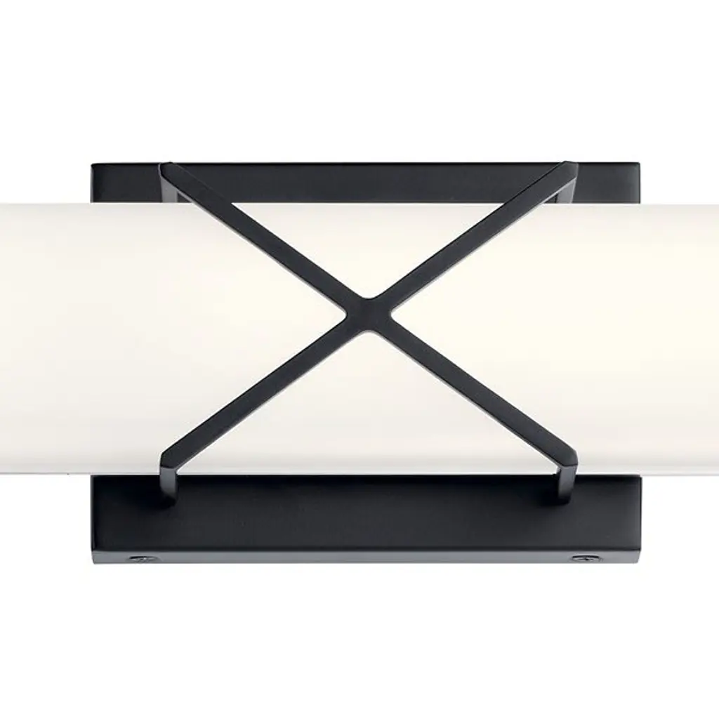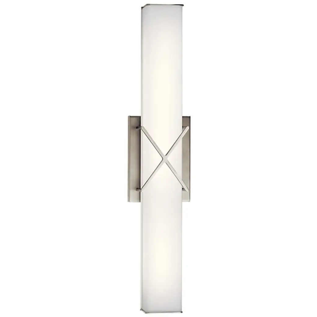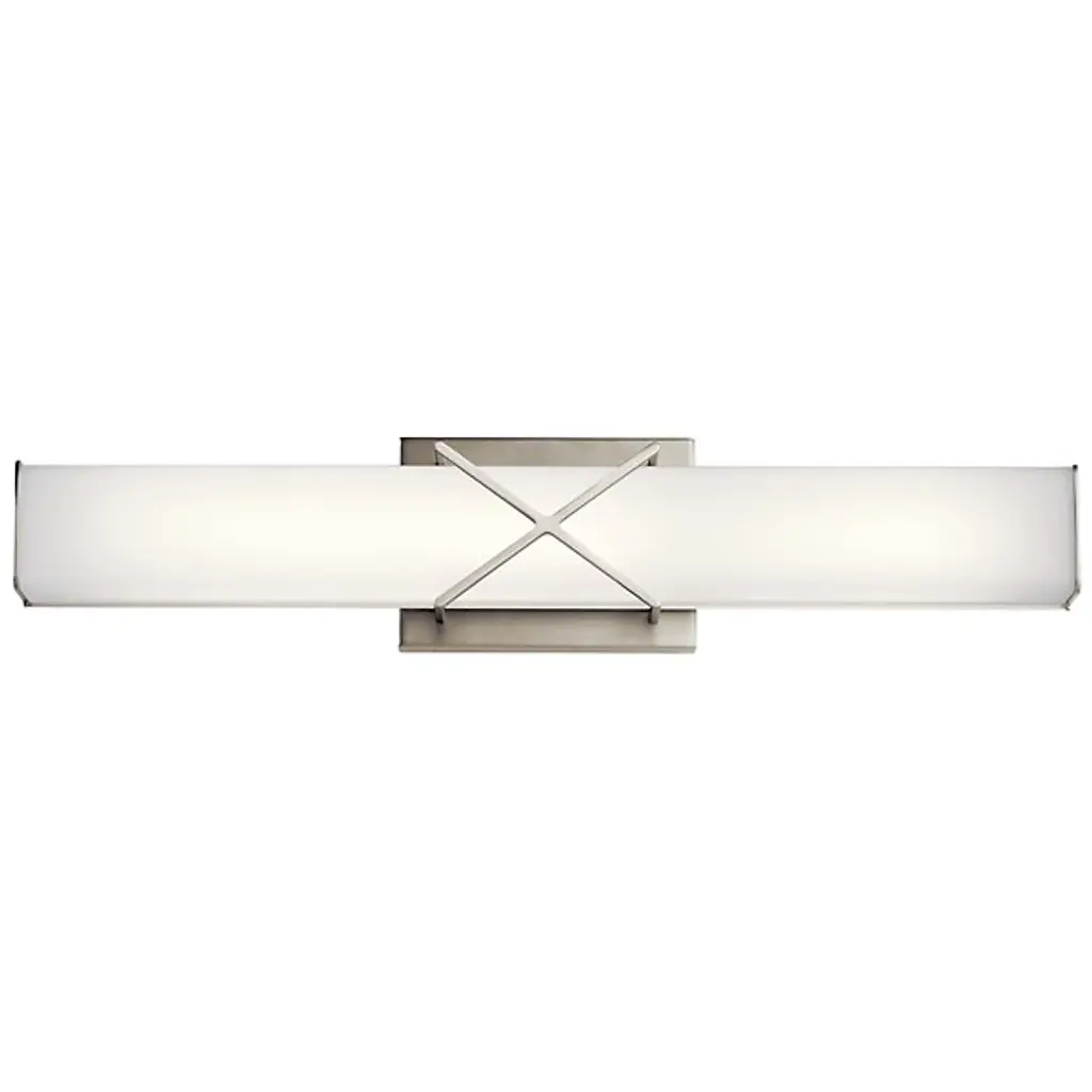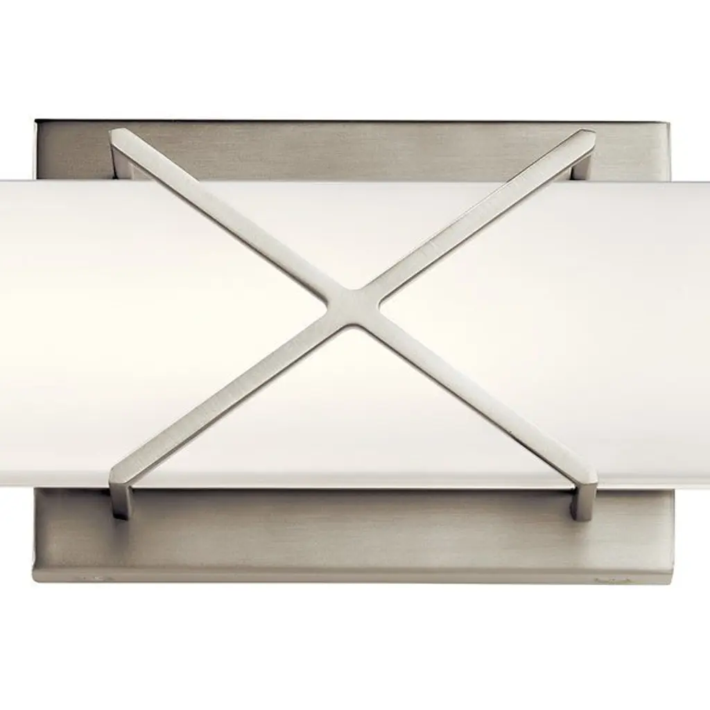 The Trinsic LED Vanity Light by Kichler conveys a subtle elegance with its long Satin Etched White glass shade and thin Polished Chrome trimming. The shade’s seamless construction allows for a soft, even ambiance as light simultaneously reflects off the wall plate’s extended cross pattern. This intricate, but low-profile piece works especially well in contemporary bathroom settings, where its light can be as functional as it is pleasant.