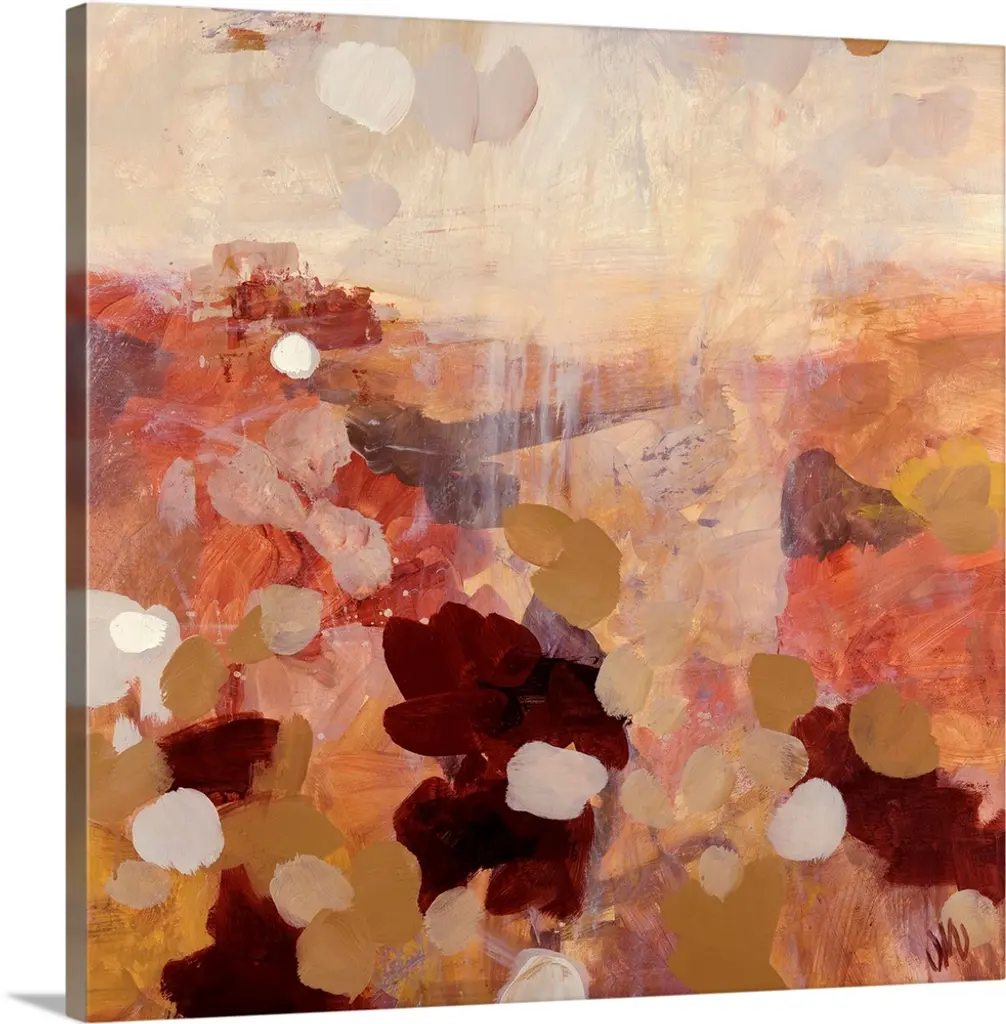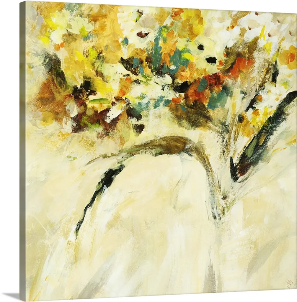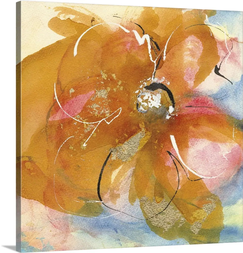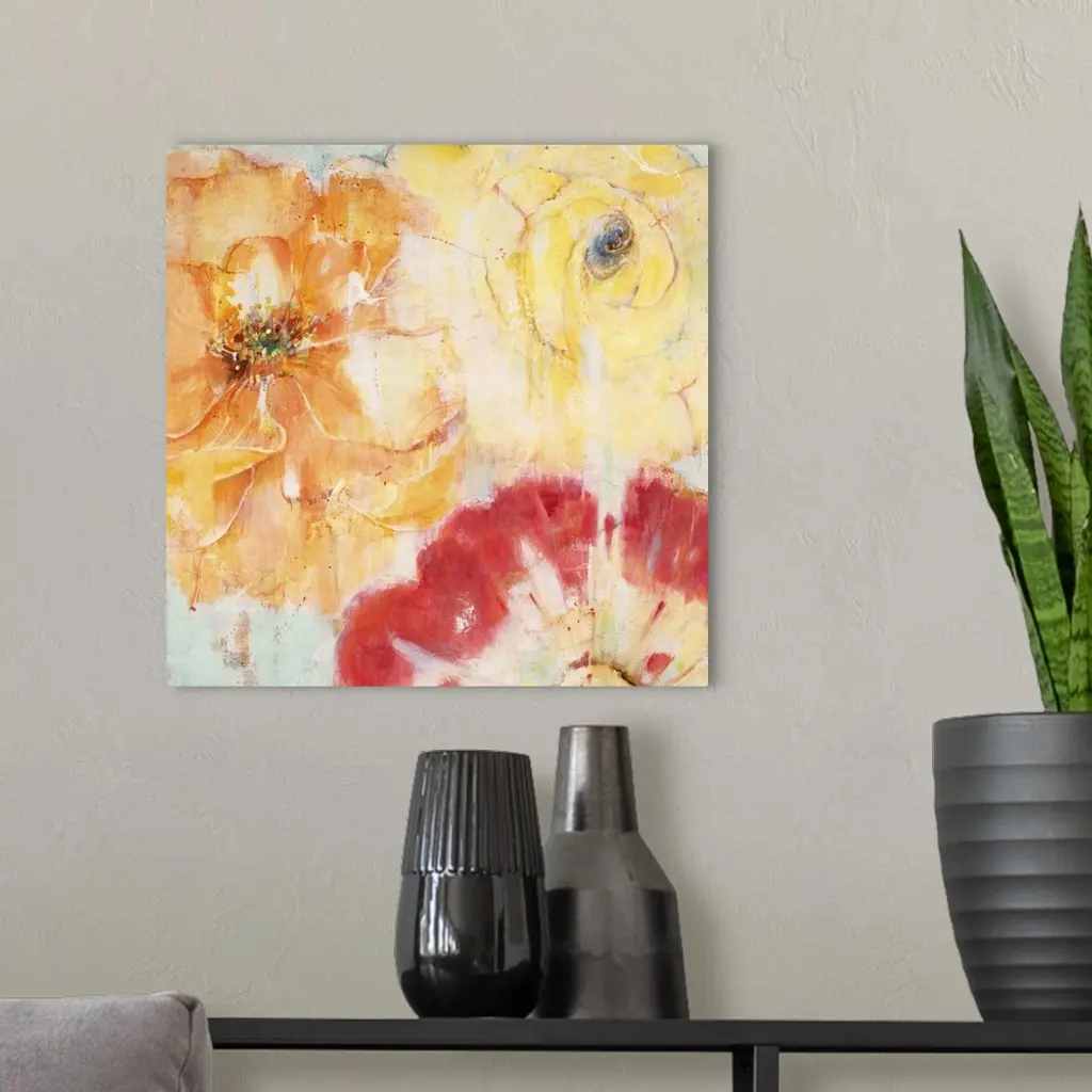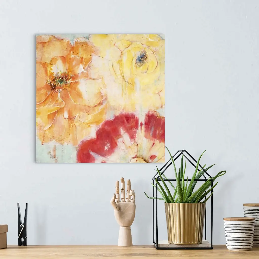 Contemporary painting of vibrant red orange and yellow flowers close-up.