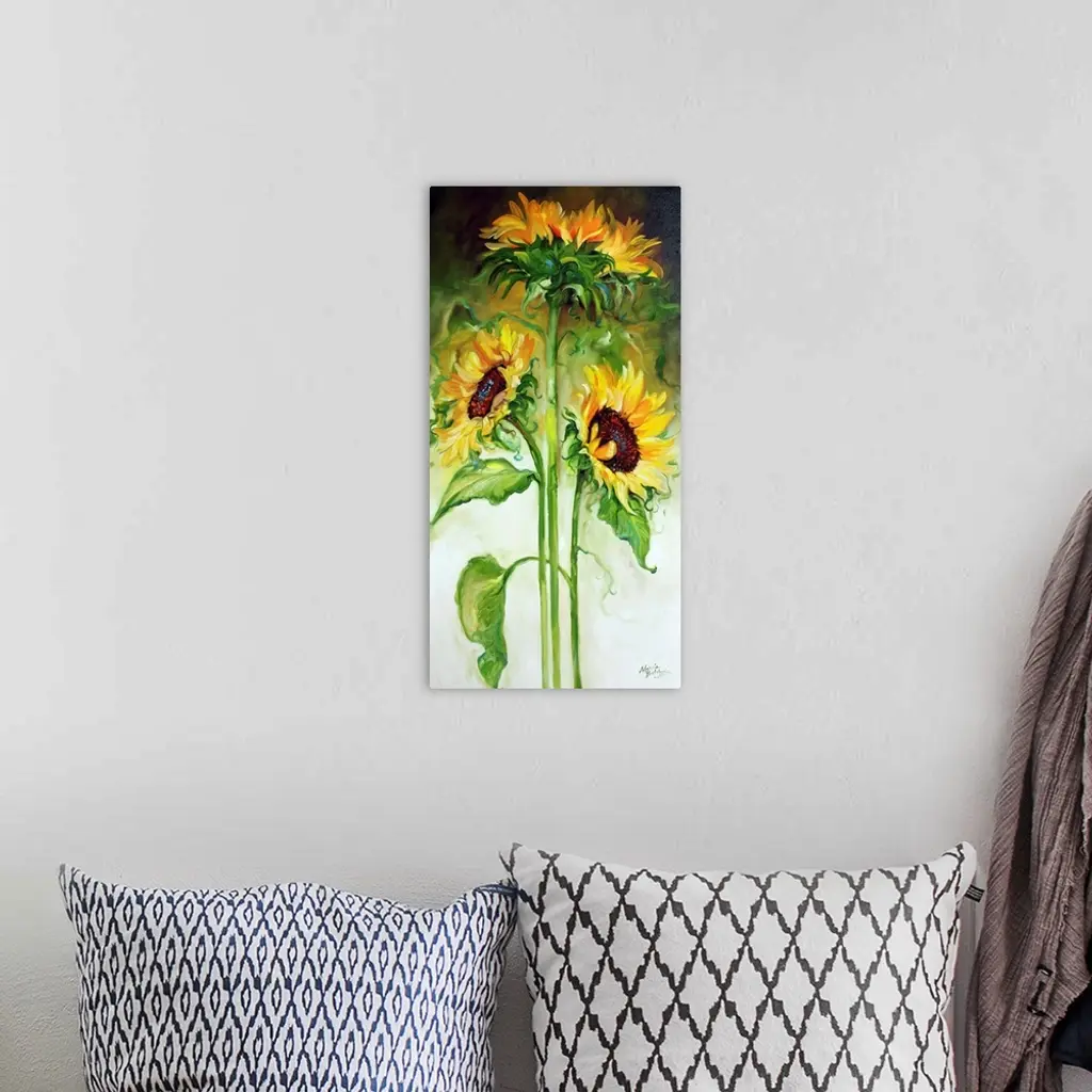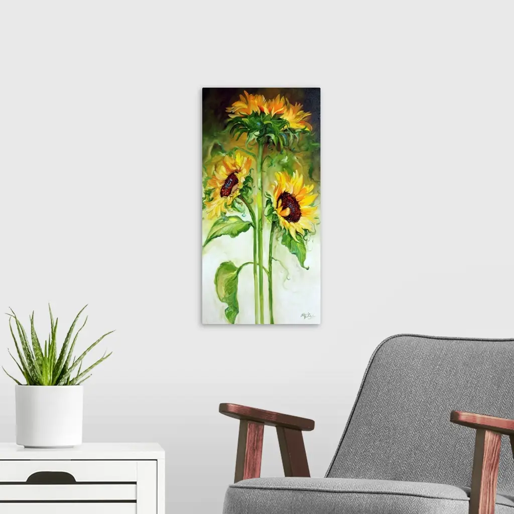Panel painting with three long stemmed sunflowers on an abstract white, green, yellow, and black background.