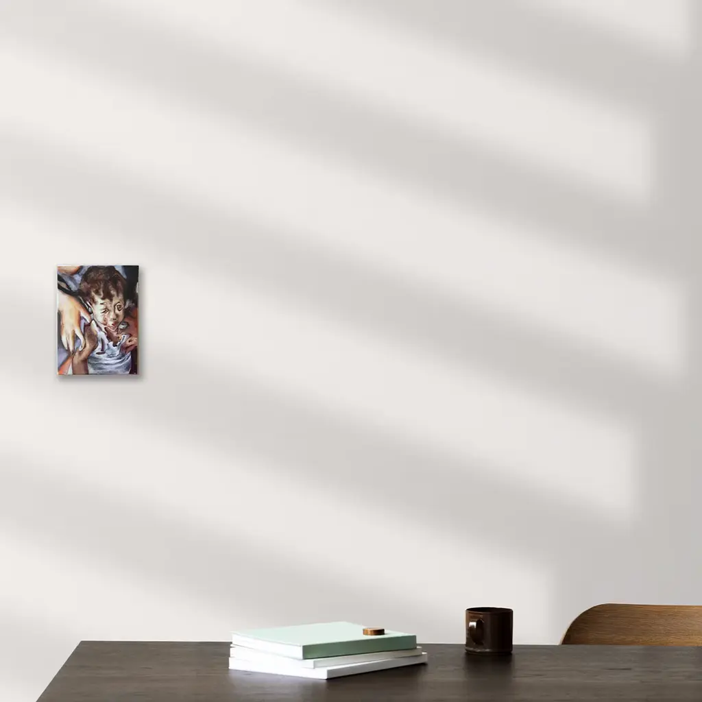 "Sadness please go away", is the tender name of this stupendous oil painting from the "Ho Abitato" series ("I have lived, or resided"), exploring memory and its malleable features. Remembrance is slowly becoming not an active initiation buy something relegated to data storage in our devices: the artist aims at restoring a lost expressivity, a forgotten personality, with a soft sense of nostalgia. This is a unique piece, delivered with a certificate of authenticity.