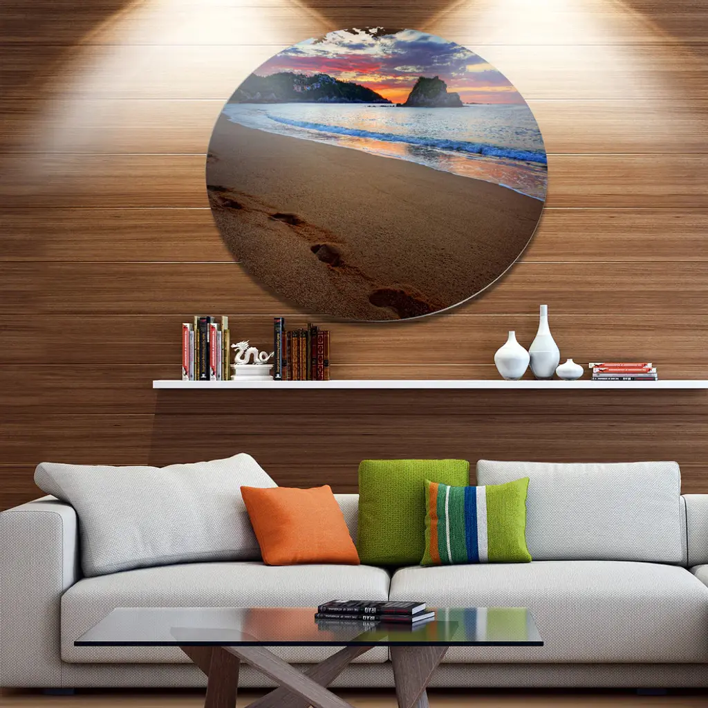 Trodden Sand On Ocean Beach, Seashore Round Metal Wall Art, 11"