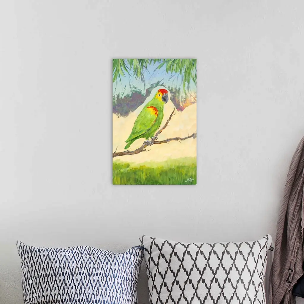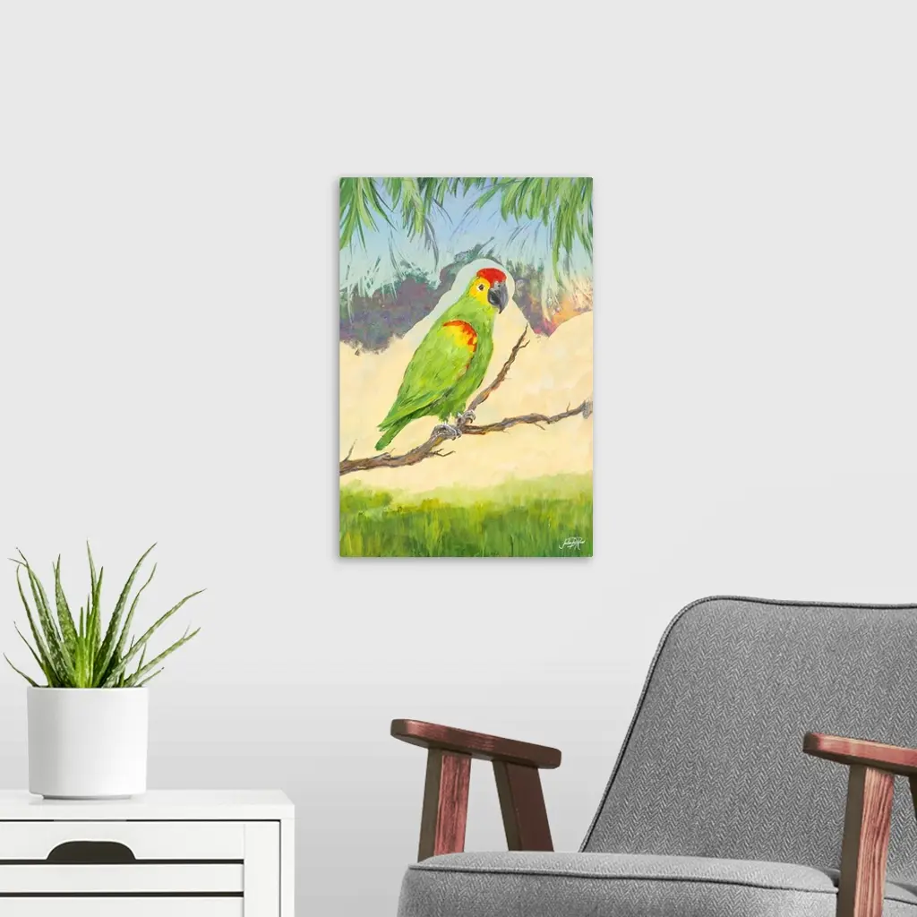 Painting of a Red Lored Amazon on a branch in a tropical scene.