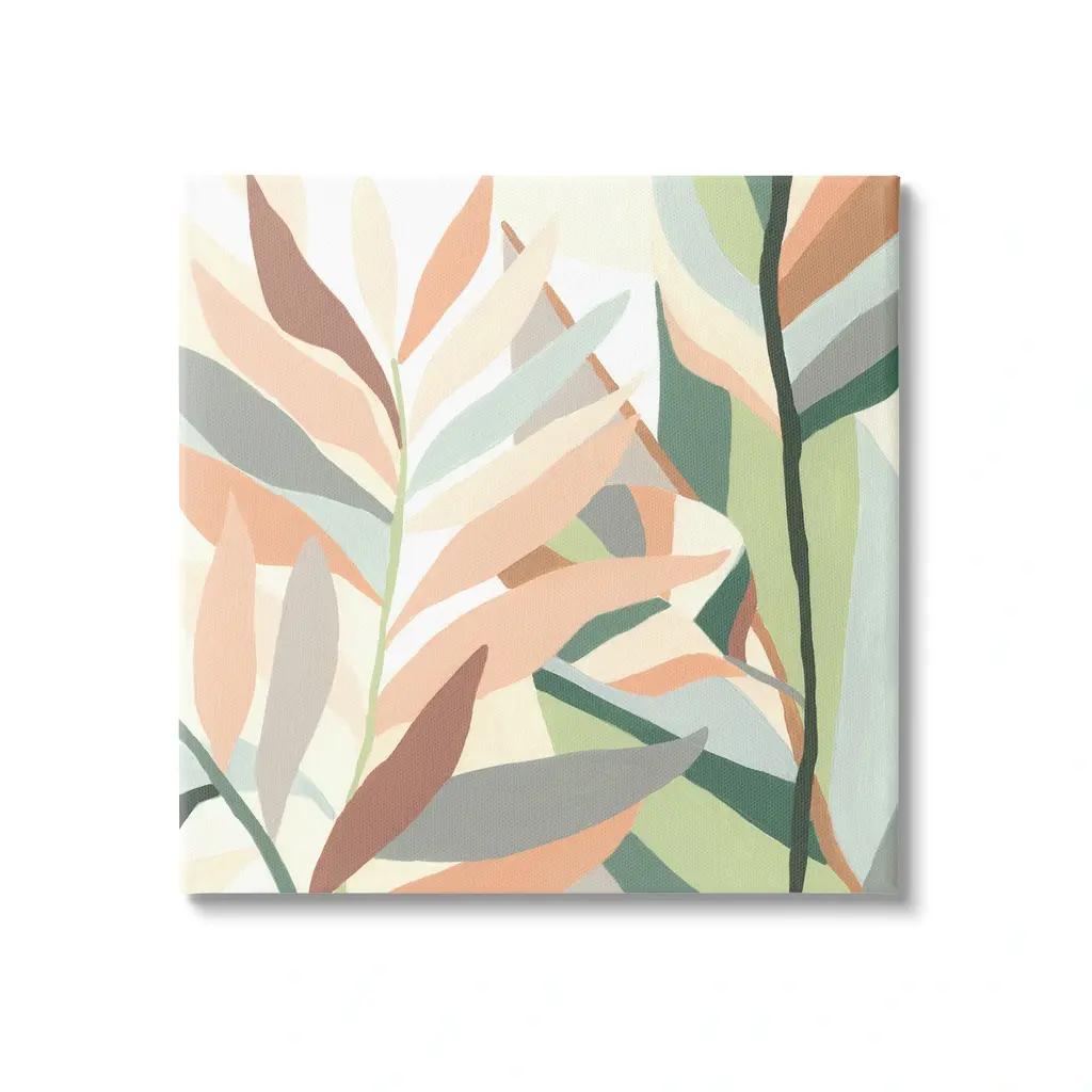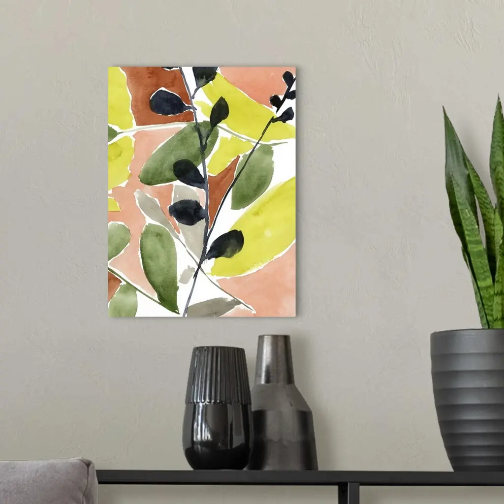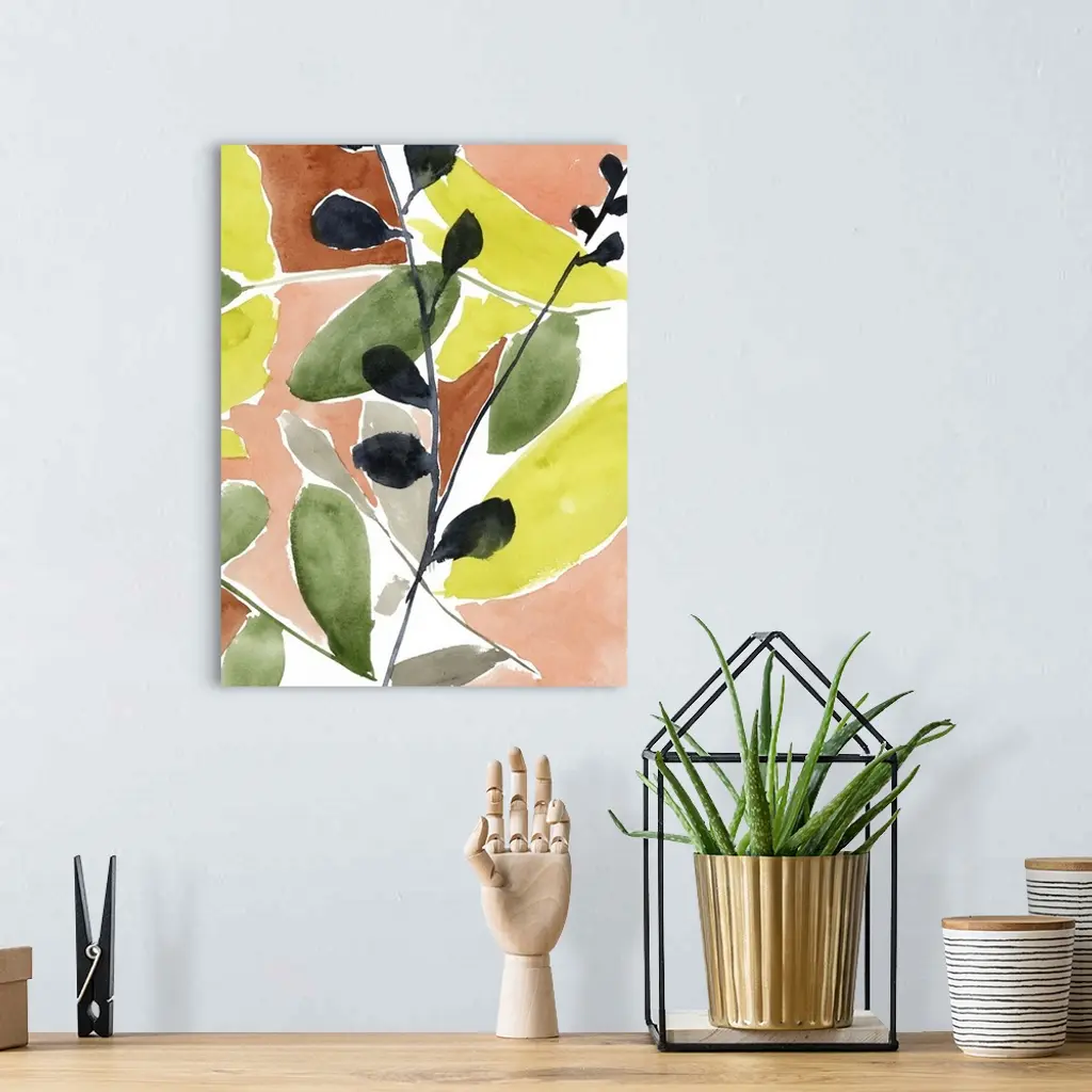 Subdued tropical colors dance across this vertical contemporary artwork with a branch of black leaves in the center.