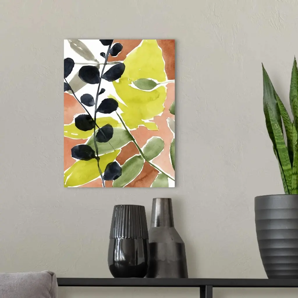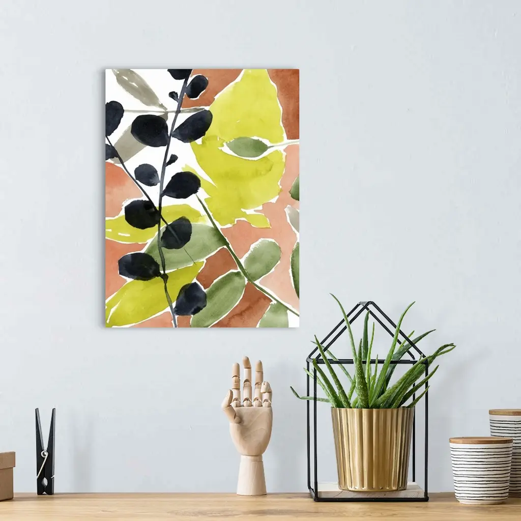 Subdued tropical colors dance across this vertical contemporary artwork with a branch of black leaves in the center.