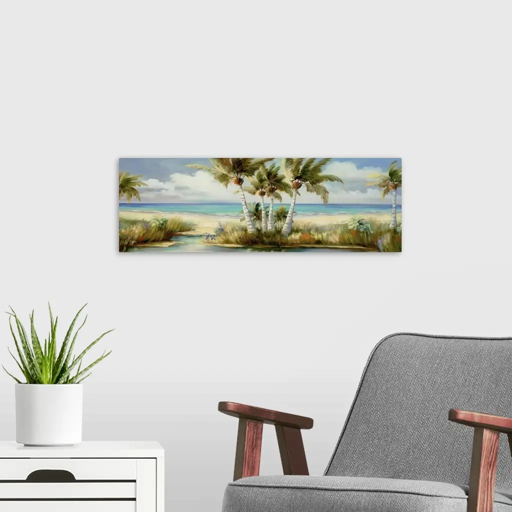 Horizontal painting of coconut palm trees along the edge of the ocean.