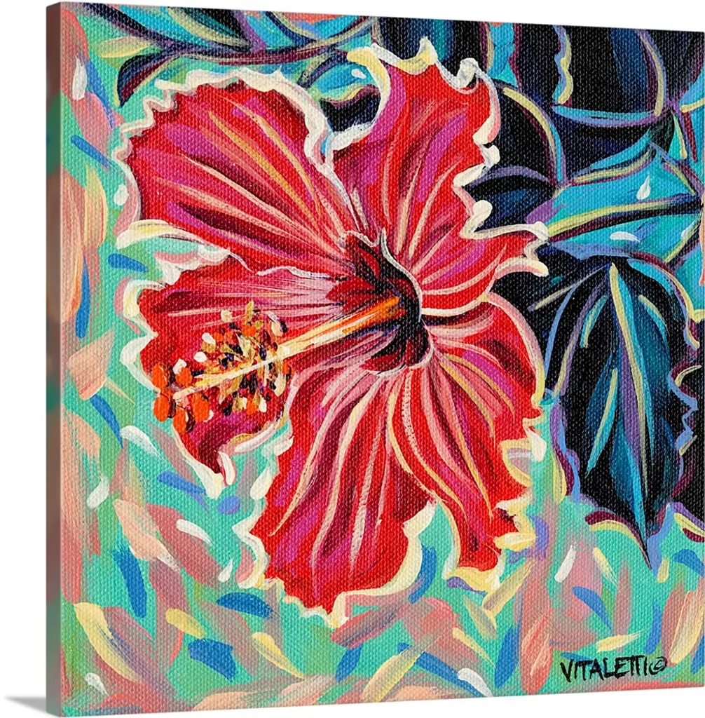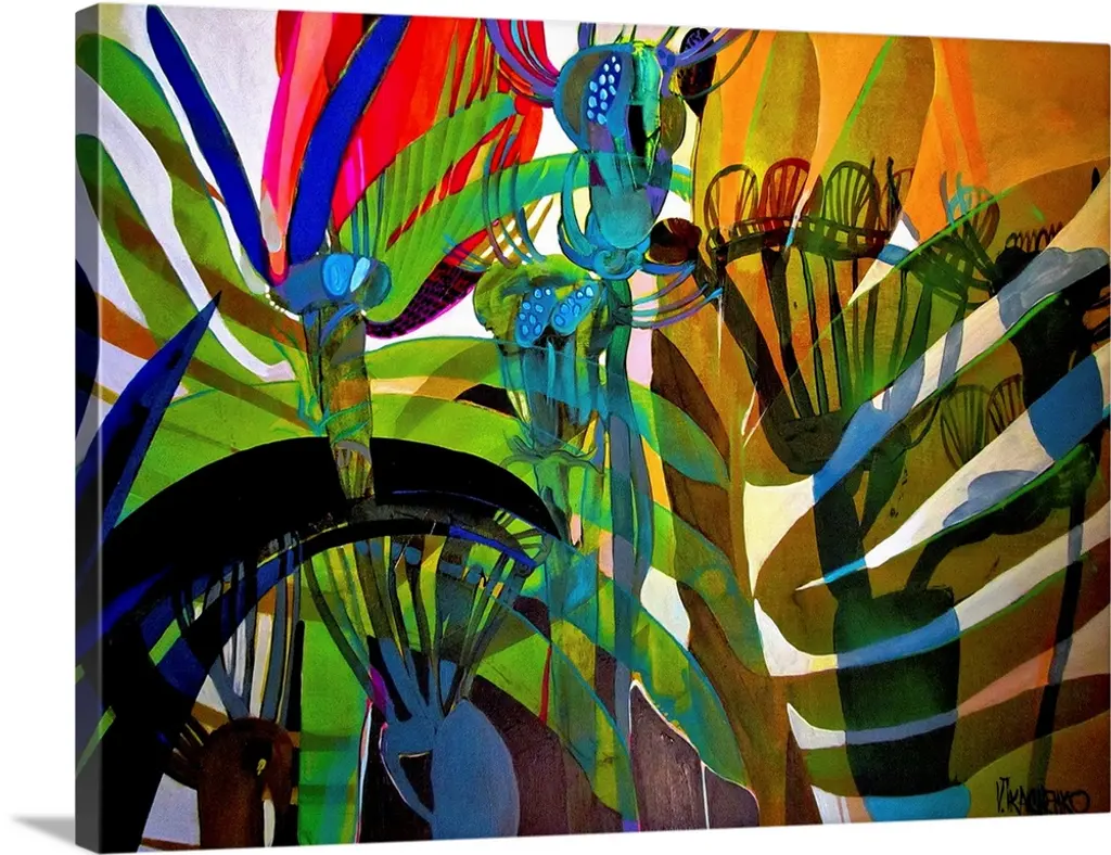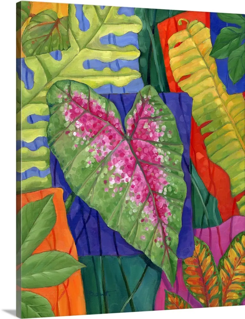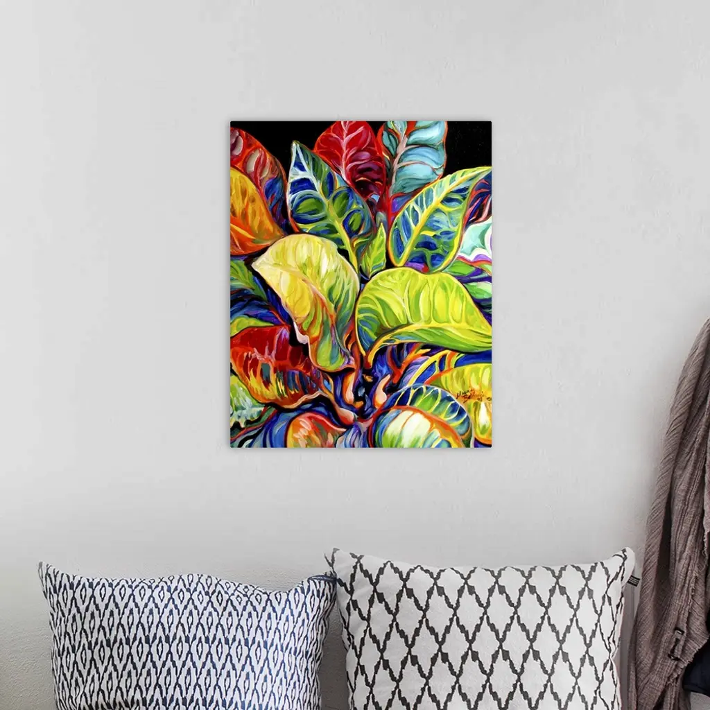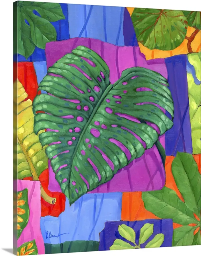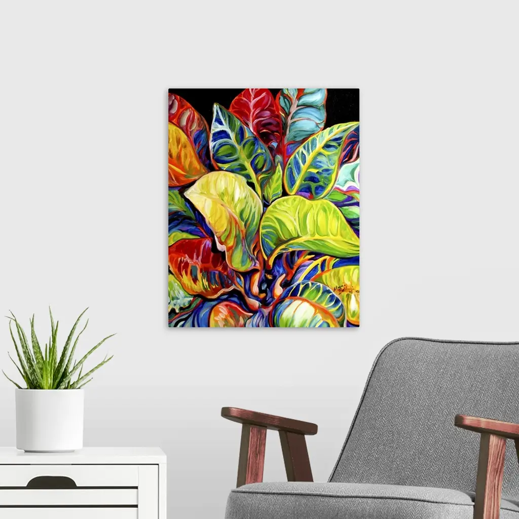 Contemporary painting of colorful tropical leaves on a solid black background.