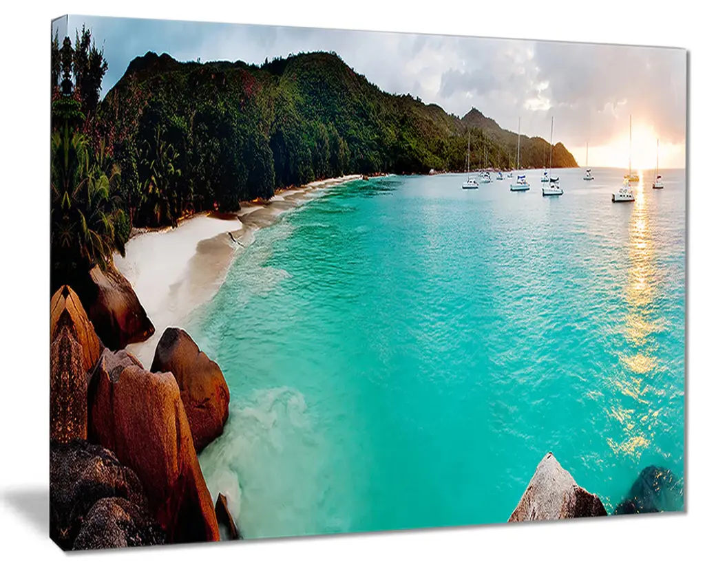 The Tropical Beach with Blue Waters canvas art print is sure to make an impression on anyone who sees it. This artwork is gallery wrapped around a 1-inch solid wood frame and arrives carefully packaged and entirely ready to hang on the wall. Design Art only uses the highest resolution and pigments to ensure a crisp colorful print that is never faded or pixelated. This artwork is sure to be a conversation starter in any home or office.