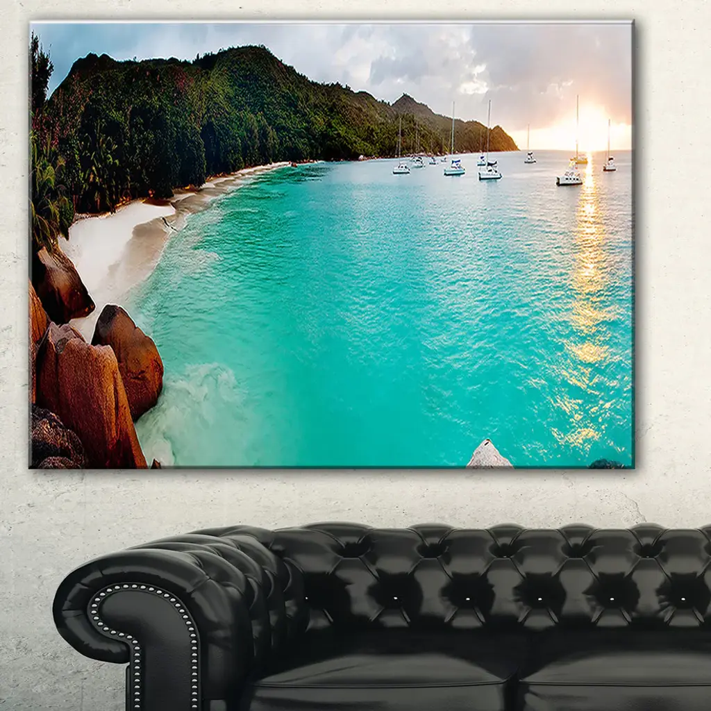 The Tropical Beach with Blue Waters canvas art print is sure to make an impression on anyone who sees it. This artwork is gallery wrapped around a 1-inch solid wood frame and arrives carefully packaged and entirely ready to hang on the wall. Design Art only uses the highest resolution and pigments to ensure a crisp colorful print that is never faded or pixelated. This artwork is sure to be a conversation starter in any home or office.